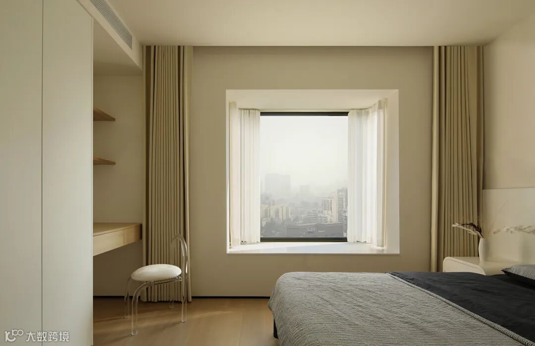 顶面做了预埋的窗帘轨道,搭配纱帘做遮挡简单又实用,视觉上也更美观简洁。