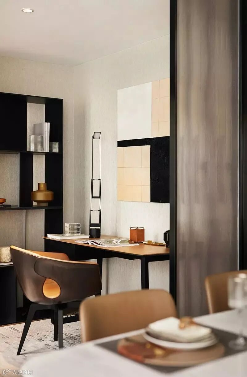 ▲书房的样板台面书桌,搭配橙色皮艺的椅子,侧边一个黑色定制书架,摆上陶艺品、书籍等装饰,带来一个成熟端庄的工作阅读氛围。