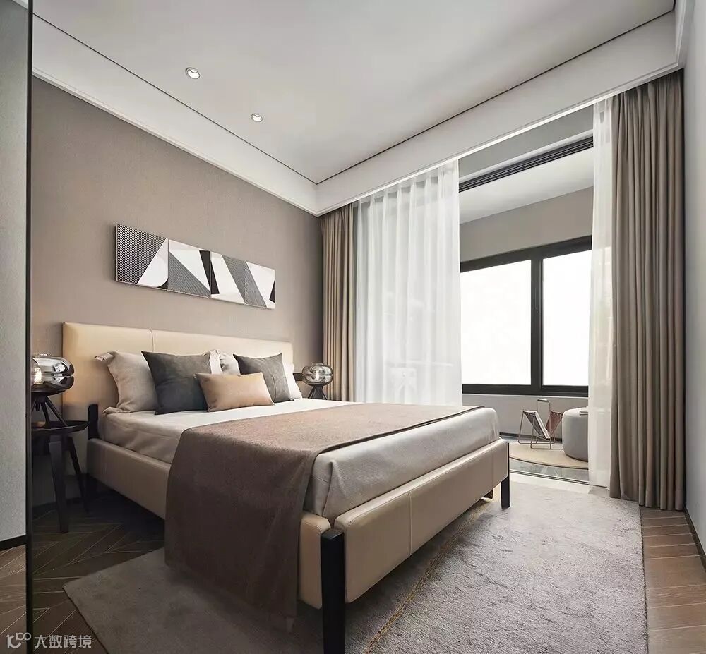 ▲父母房也是以灰麻色的床头墙,挂一幅黑白调的横幅装饰画,摆上一张米白色的皮艺床,结合素雅的床单与地毯,也使得空间更加浪漫情趣而舒适自然。