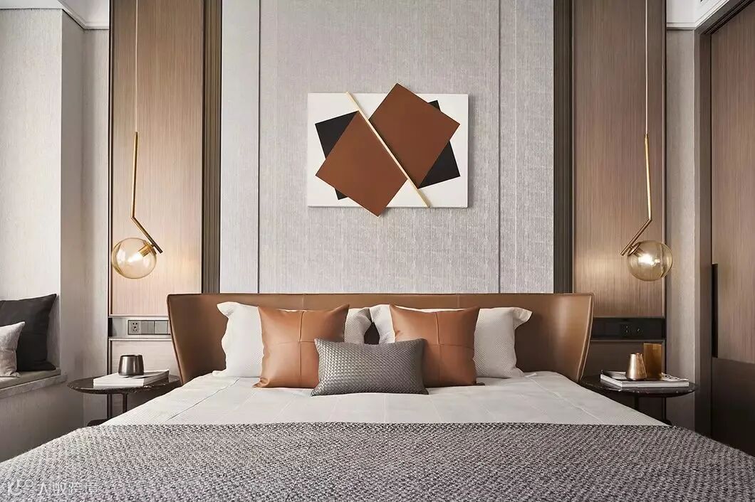 ▲卧室床头墙两侧木饰面+中间硬包的组合,布置棕橙色的皮艺床,还有简洁素雅的床单、地毯与窗帘,也让空间显得更加简雅端庄、档次十足。