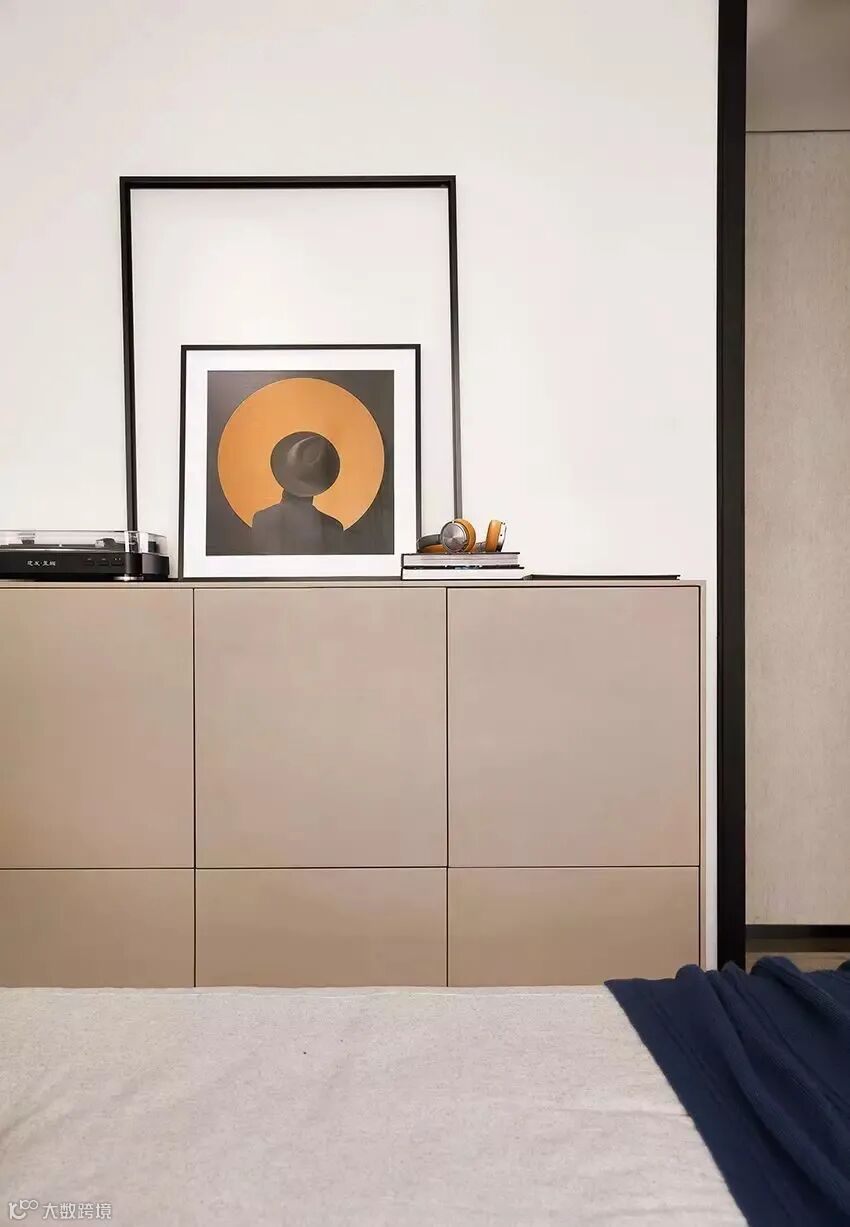 ▲床尾摆上一个深色复古范的斗柜,摆上黑白色调的装饰画,也使得空间更加华丽精致而优雅。