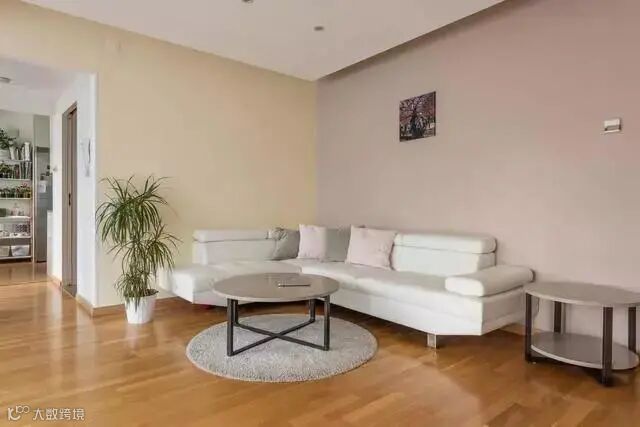 玄关的后侧就是客厅,奶白色沙发和银灰色茶几看起来简约又温馨。黄色和灰色墙壁,看起来很干净,在绿植的点缀下,很有生机。