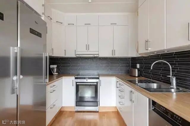 冰箱的右面就是厨房了,白色橱柜和黑色墙砖的搭配,简约又耐看。厨房给人整体看起来很商务、沉稳的感觉。