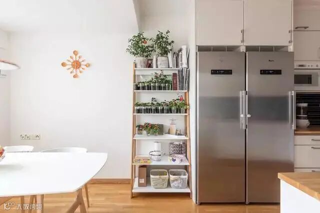 餐桌的后面是一排置物架,屋主在上面摆放了很多的绿植和其他的小东西,蛮有格调的。置物架的右侧是冰箱,冰箱也隔断了餐厅和厨房的空间。
