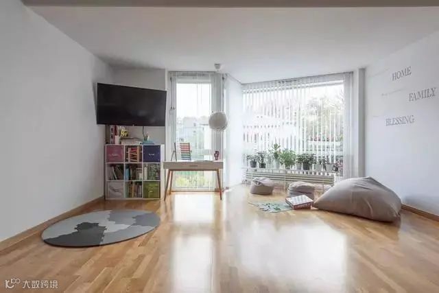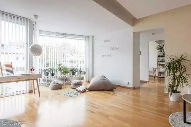 一进到屋子里视野就特别开阔,心情也变得很好。木质地板和白墙的搭配很简约。