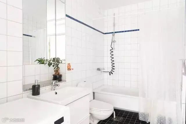 卫生间的装修设计,看起来也很舒服。浴帘隔开了马桶、洗漱台和浴缸。白色瓷砖放入了一点蓝色腰线,再配合黑色的地砖,视觉上很舒适。看完之后,是不是也觉得顶楼其实也不错呢。