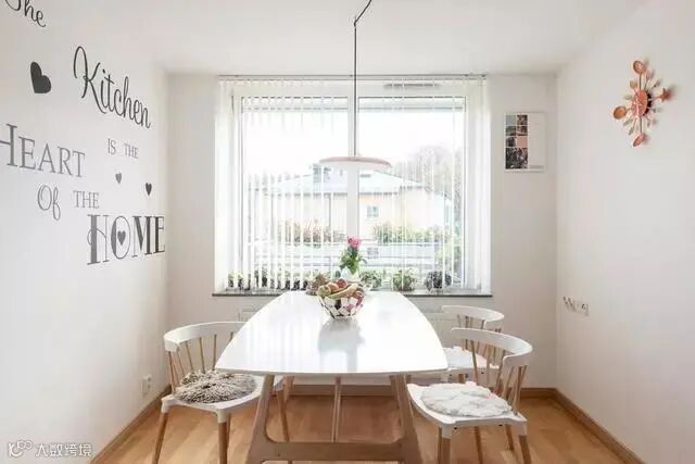 看完客厅,再来看下餐厅吧。白色墙壁、白色餐桌、白色餐椅的搭配看起来干净又简约。而且餐厅的采光效果很好,窗户正对着入户花园,而且装上了装饰性很强的百叶窗。坐在餐桌这里吃着饭看着窗外的风景,感觉吃饭都更香了。