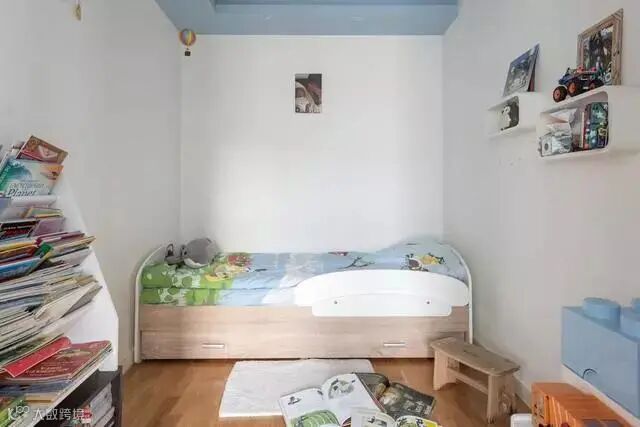 儿童房的主要配色是白色和蓝色,清新又治愈。墙上装了两个小的置物架,可以摆放一些孩子喜欢的玩具。左面是一个书架,可以放很多孩子喜欢看的书,培养孩子爱看书的好习惯。
