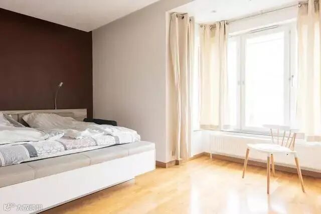 卧室的窗户特别大,采光效果特别好。棕色墙壁和白色墙壁的搭配,视觉上看起来简约又干净。