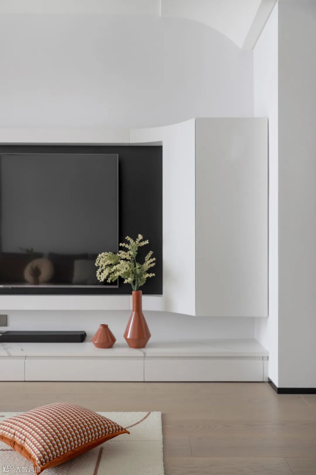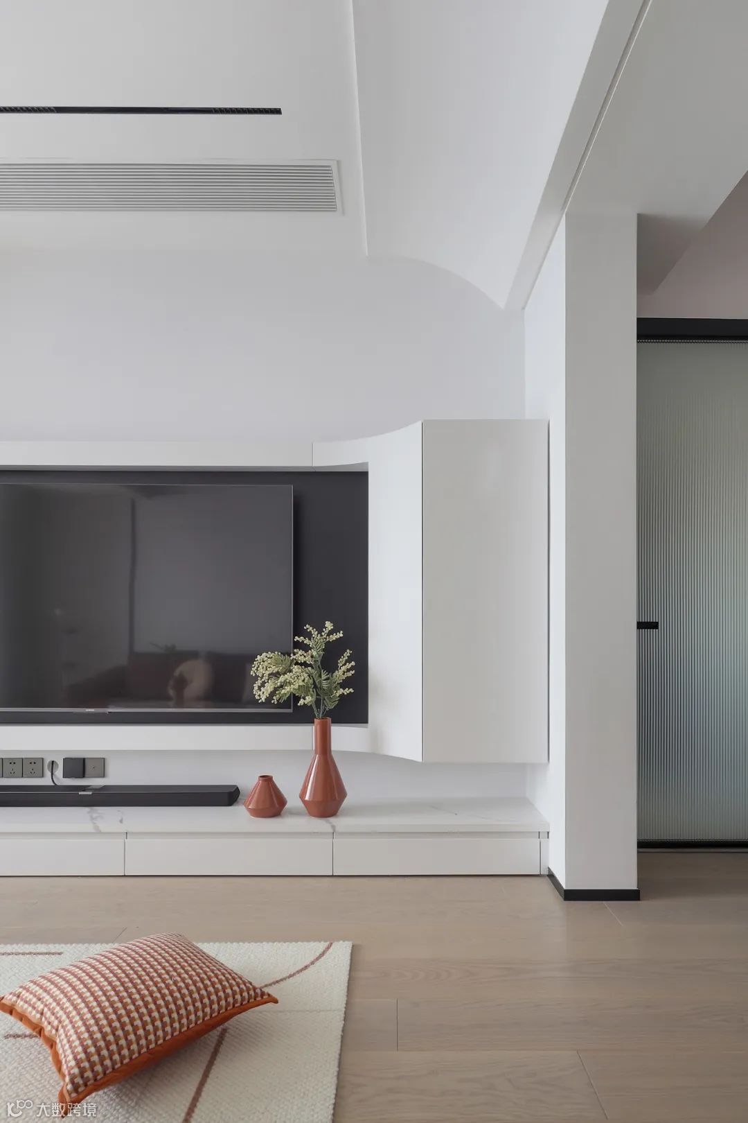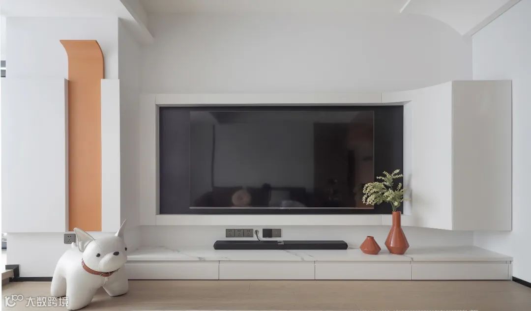 看到沙发纯白背景区域有个大弧转角吗?我不说你一定不知道这里面藏着雨水管吧?!同时,里面还是一组空间巨巨巨巨大的收纳柜!