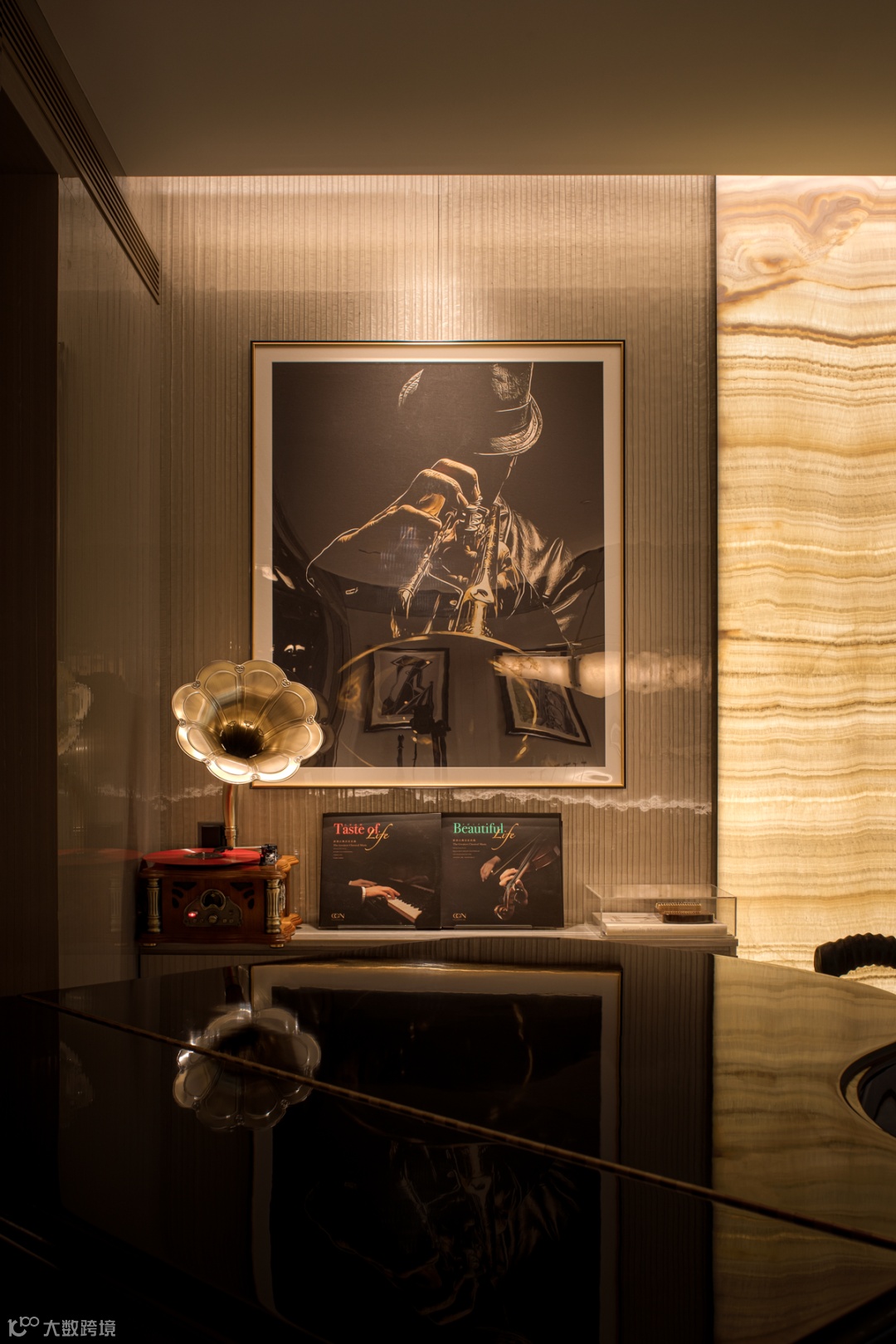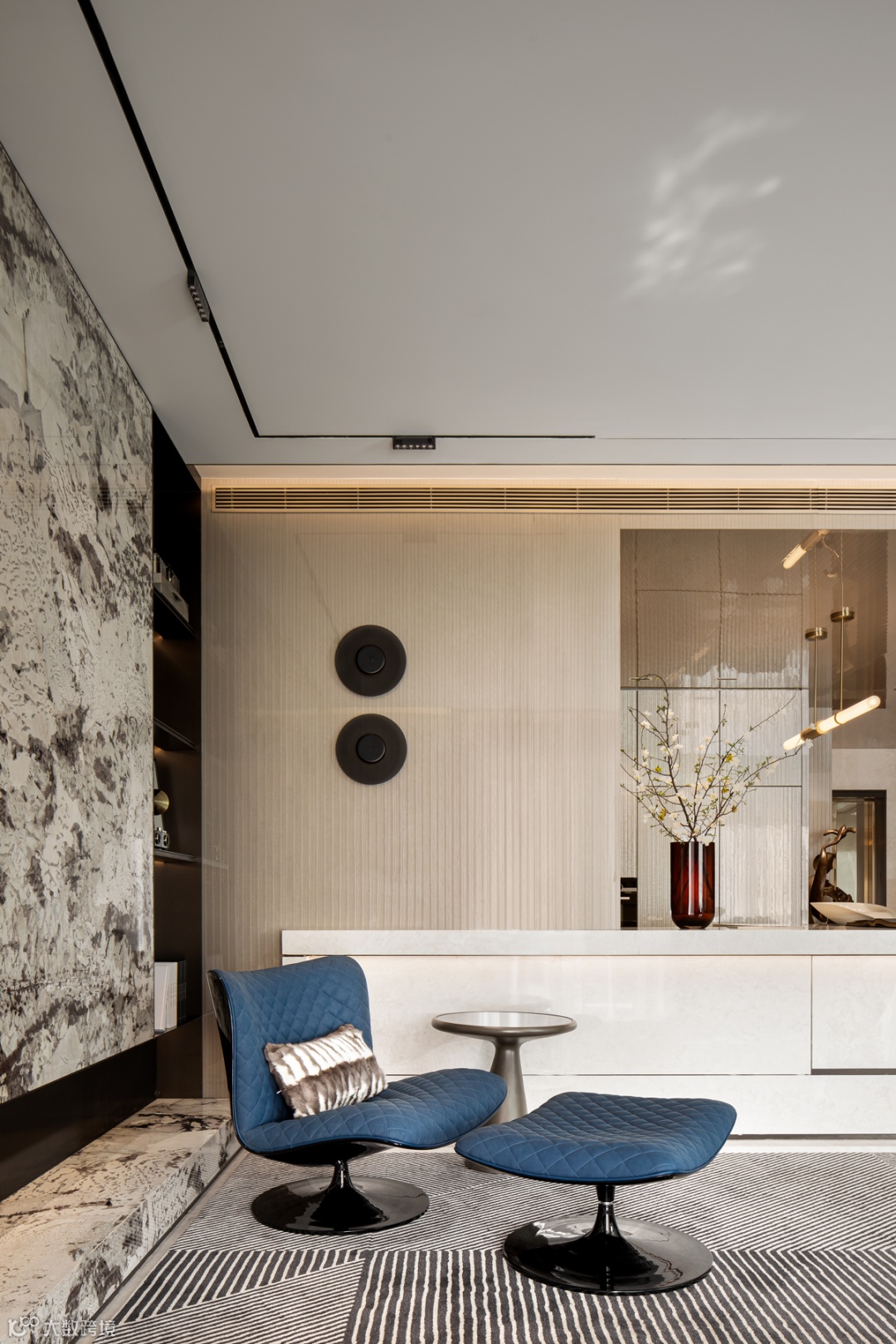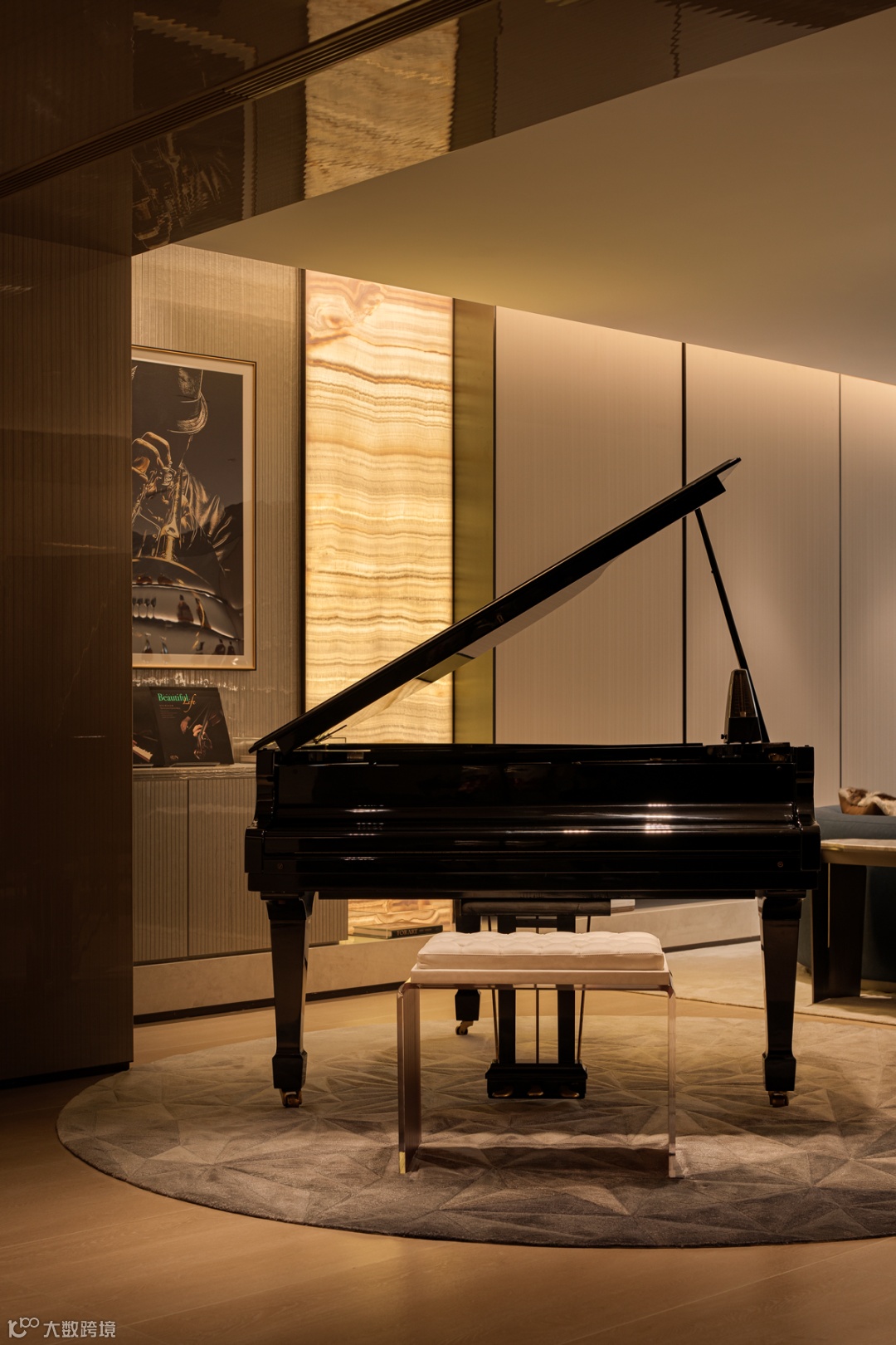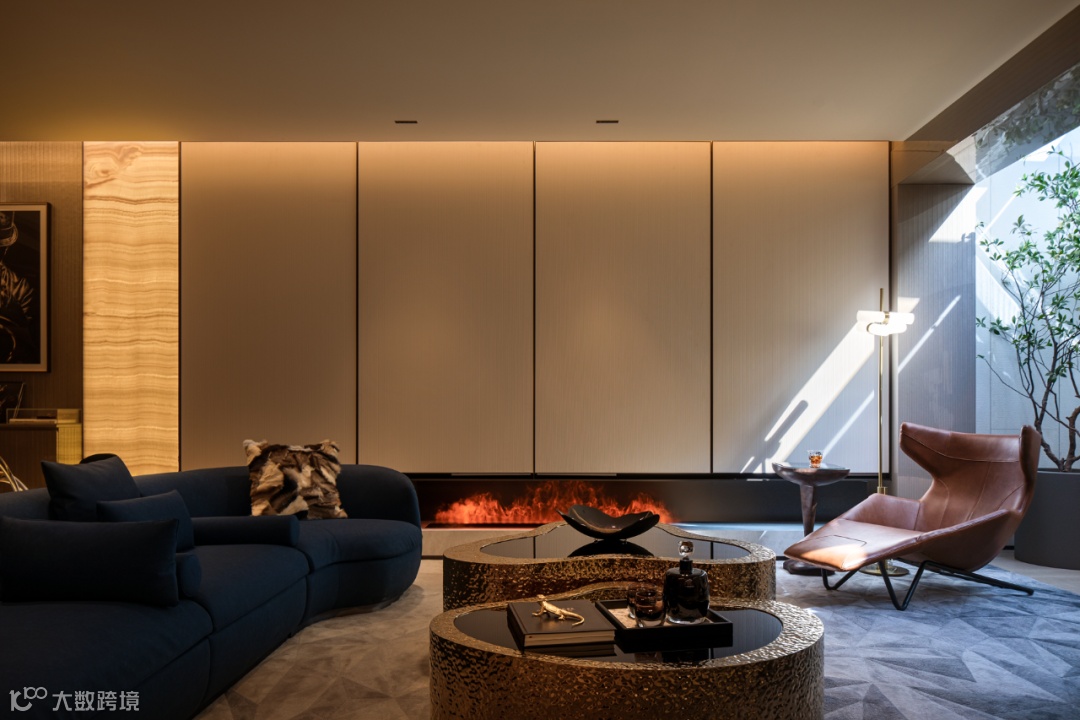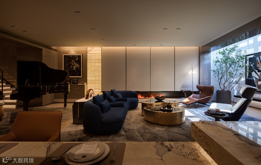 铺设圆形地毯的中庭位置,打造成钢琴演奏区,等待着音乐的回响。柔软的沙发上任由肆意慵懒,添上三两杯酒,灯光炉火,家人闲坐,灯火可亲。