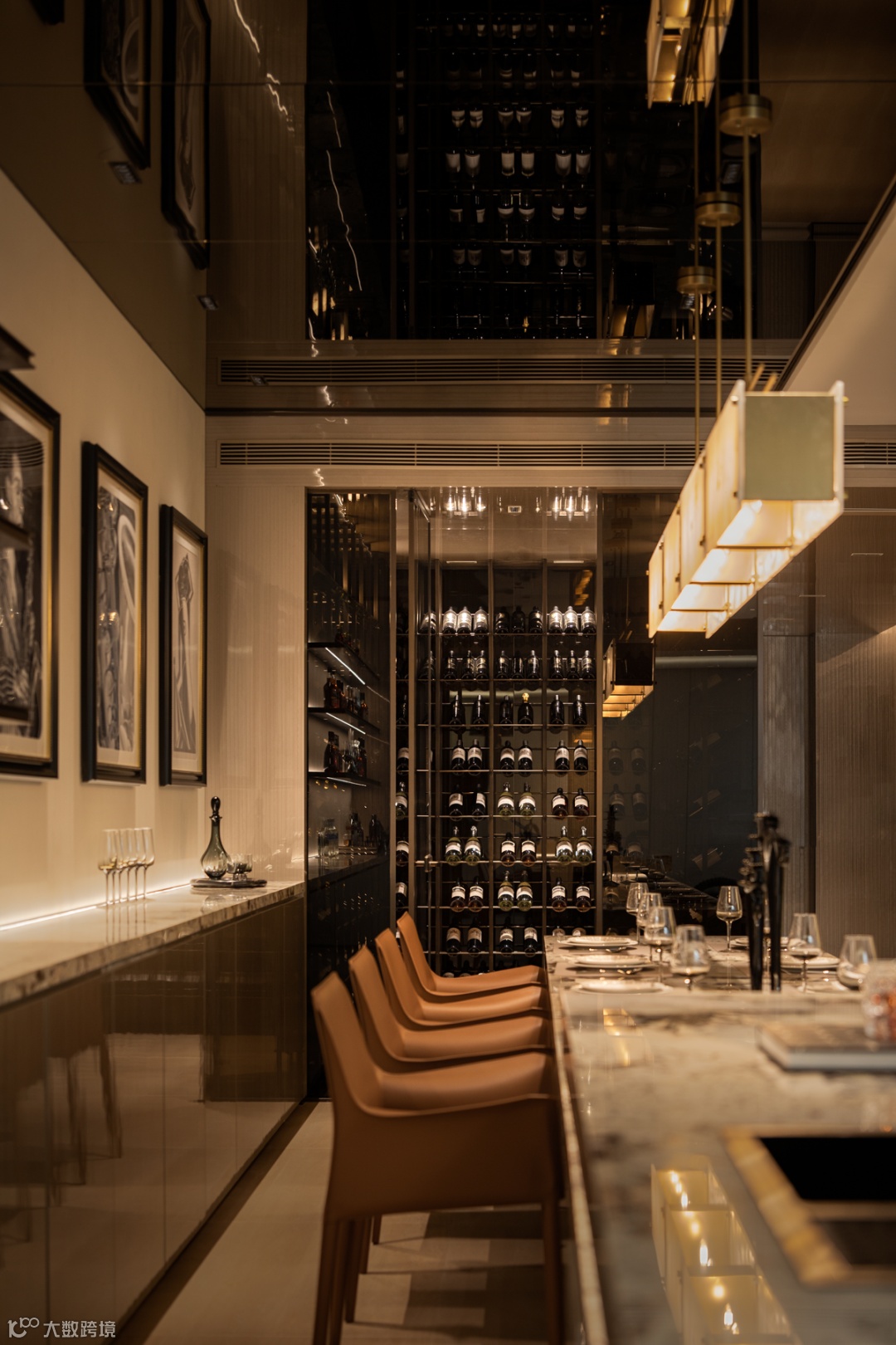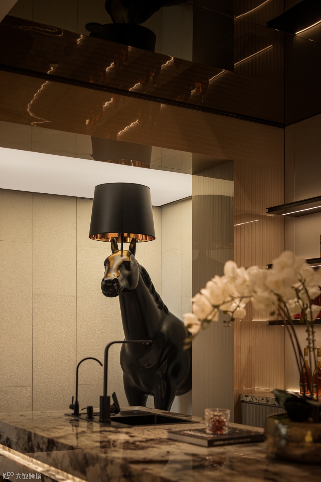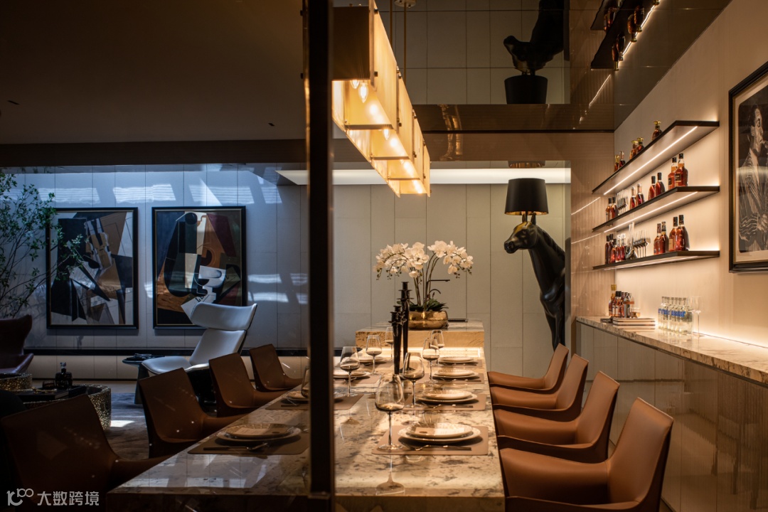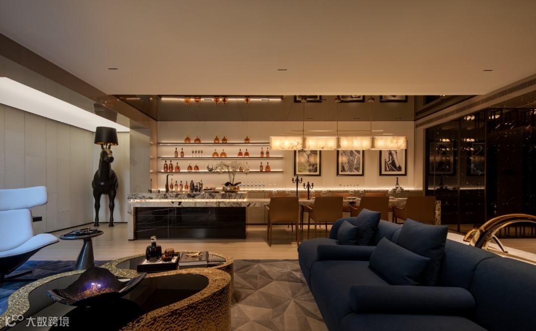餐厨区域与客厅,以不同的材料和色块对功能区域做软性分割,白与金的基调结合金属、石材、玻璃的饰面,轻奢感应付而生。