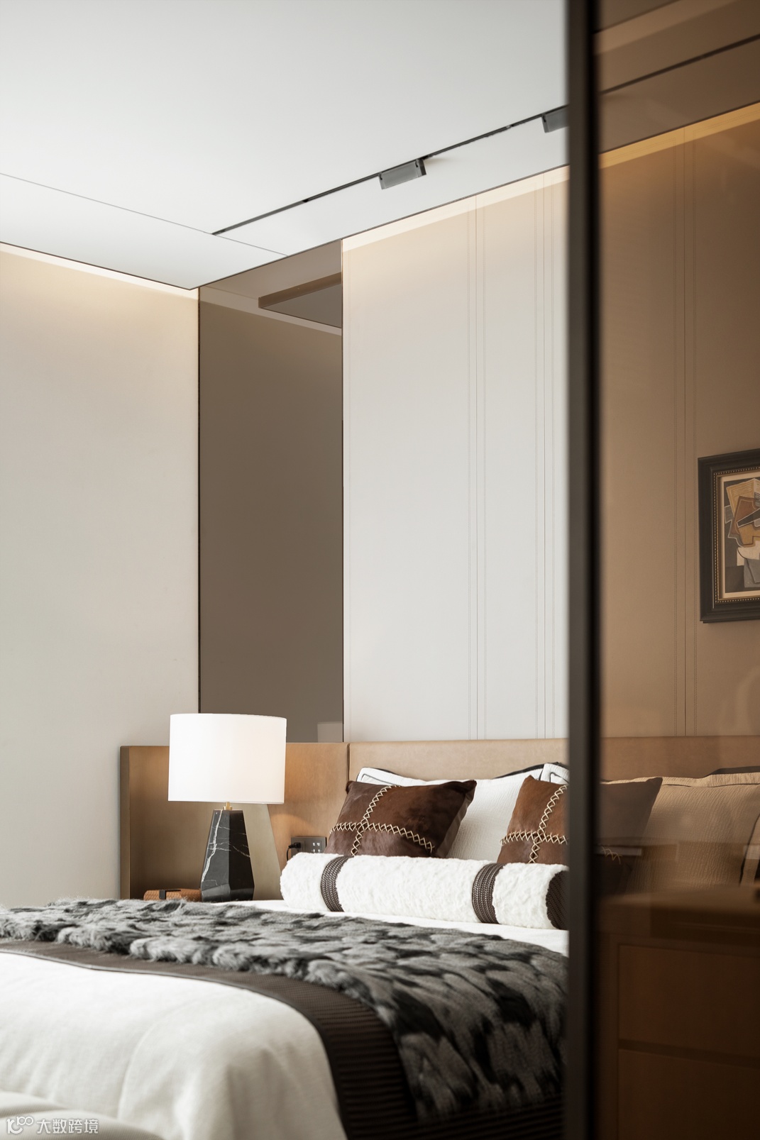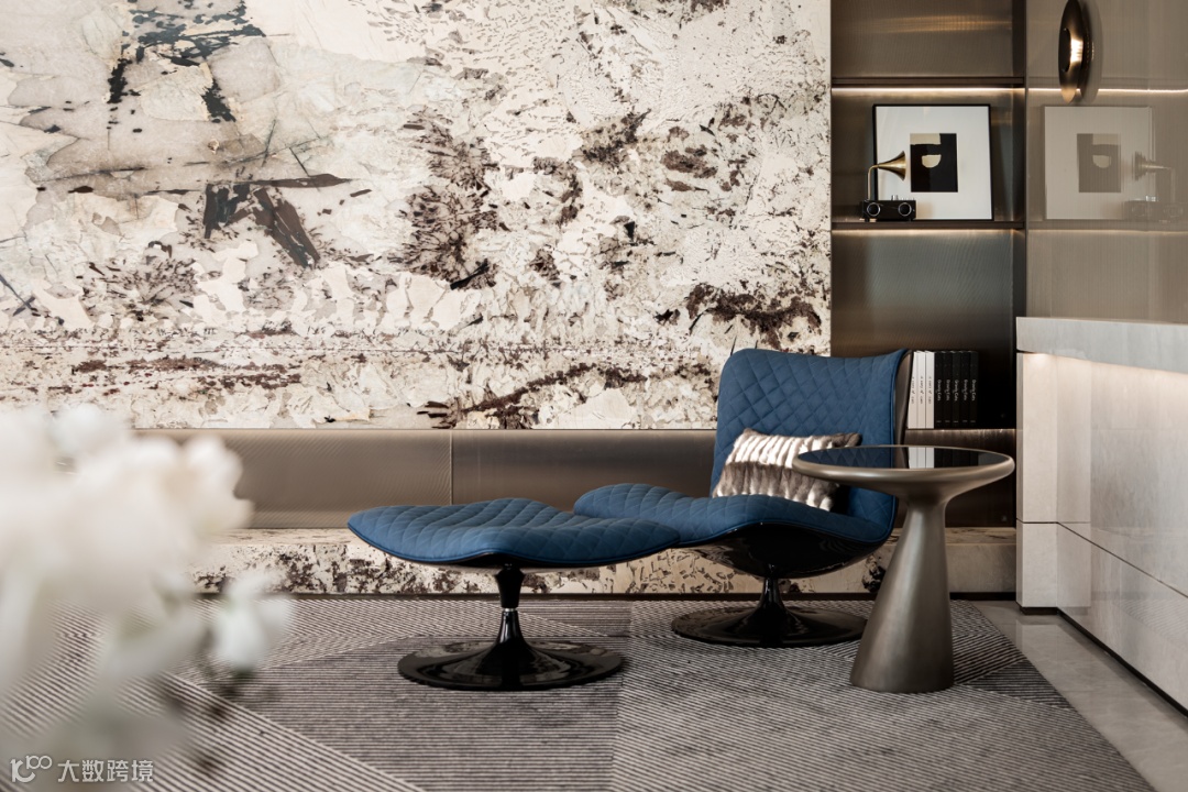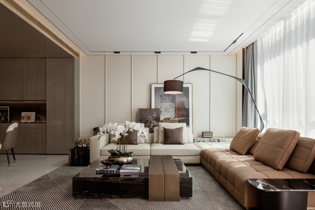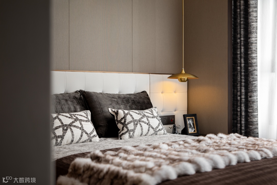 材料差异、颜色搭配、质感层次等塑造着空间的不同肌理与氛围。主卧咖色、白、金的配色,附着在皮革和布艺之上,表现出低调的华丽。