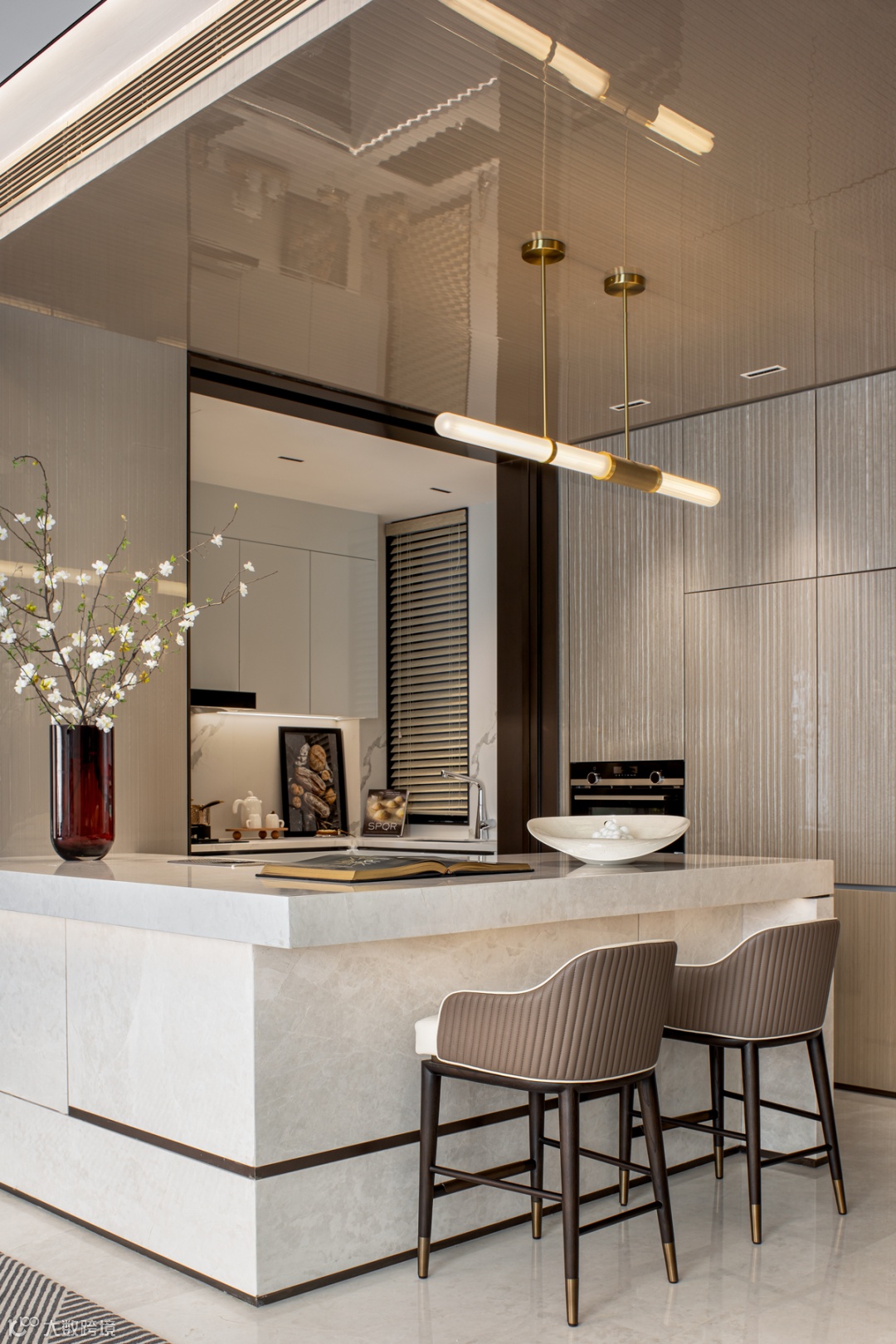 开放式的中厨开阔了整个布局,西厨中岛的设计与中厨相互补充,在提升了空间利用率的同时也梳理了空间动线。