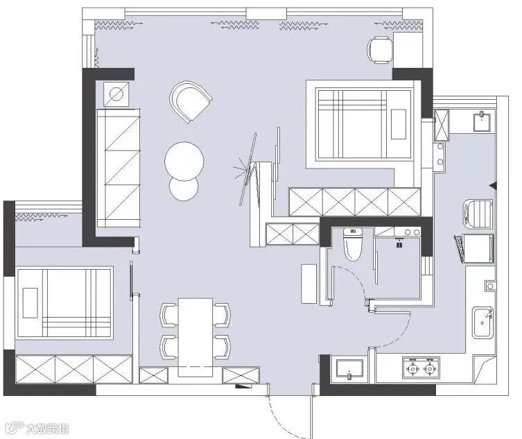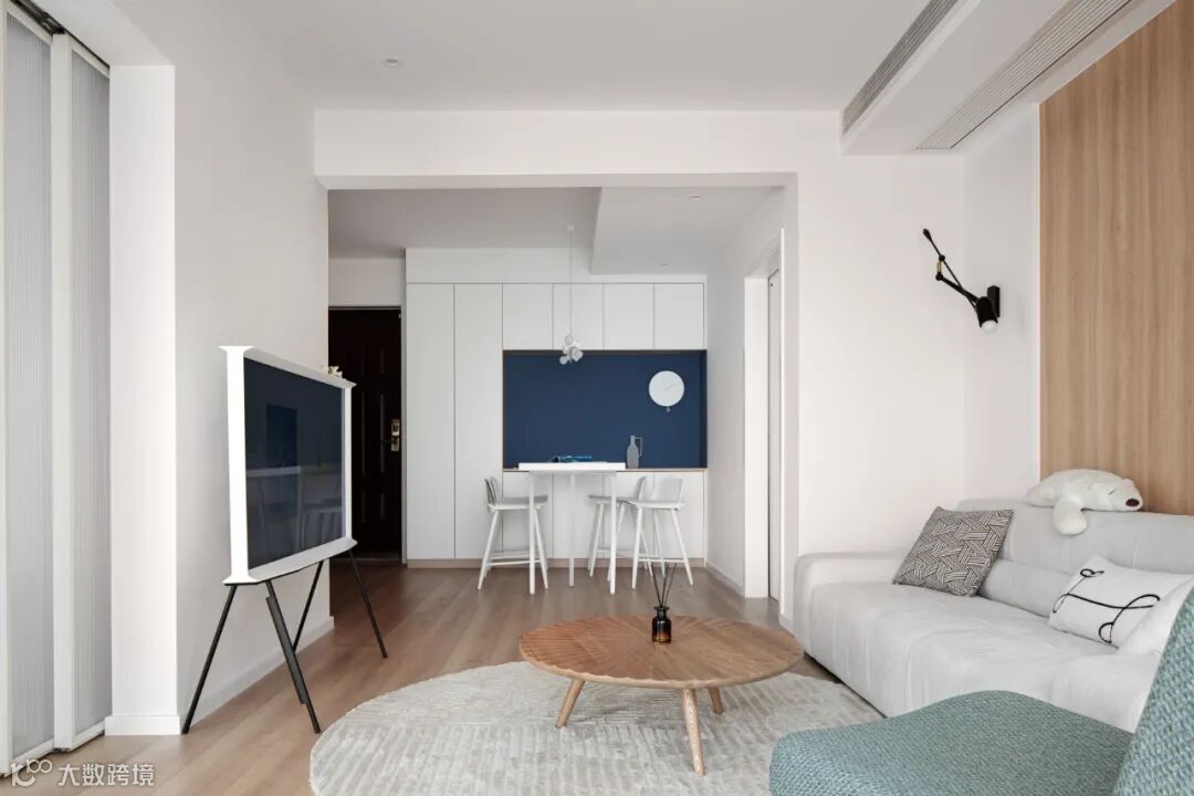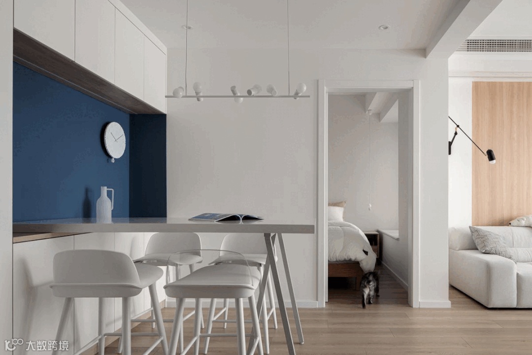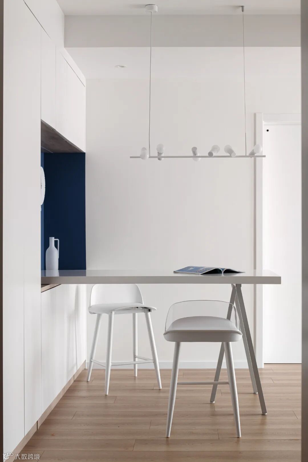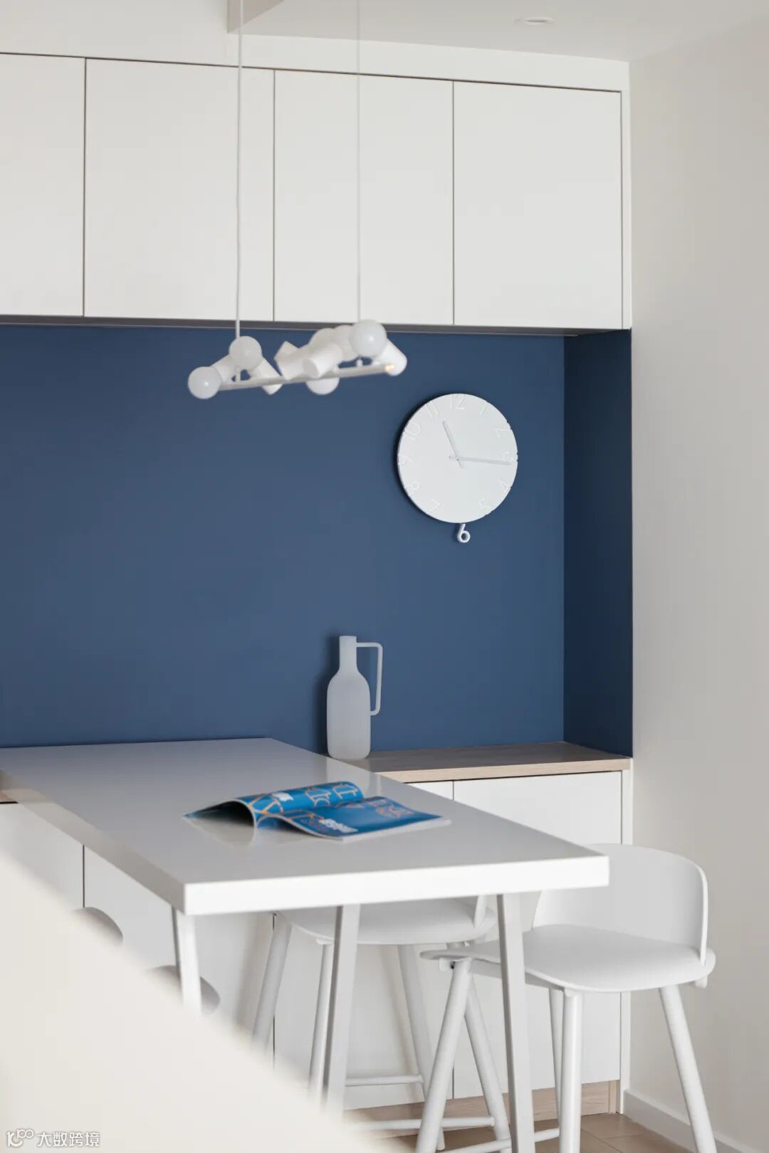 缩小次卧,扩大餐厅区域,做入户玄关,形成独立且共享的公共区域。转角的一抹蓝,我们称之为米诺克斯蓝,是隐藏情绪的最佳底色。