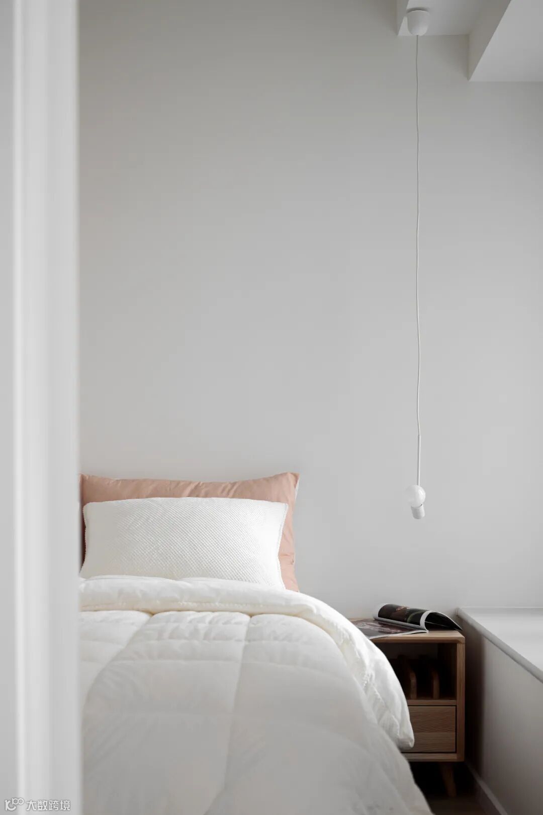 调整到面积刚刚好的次卧,以低饱和度的色彩与柔软的布艺、单纯工艺的吊灯形成自由而静美的寝居感。