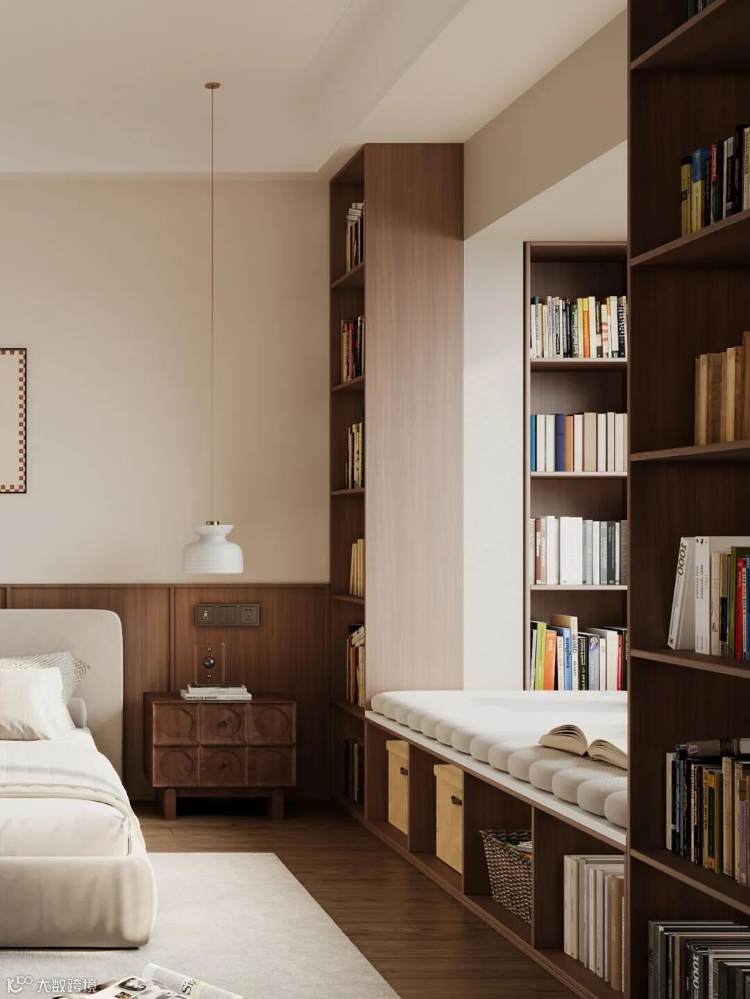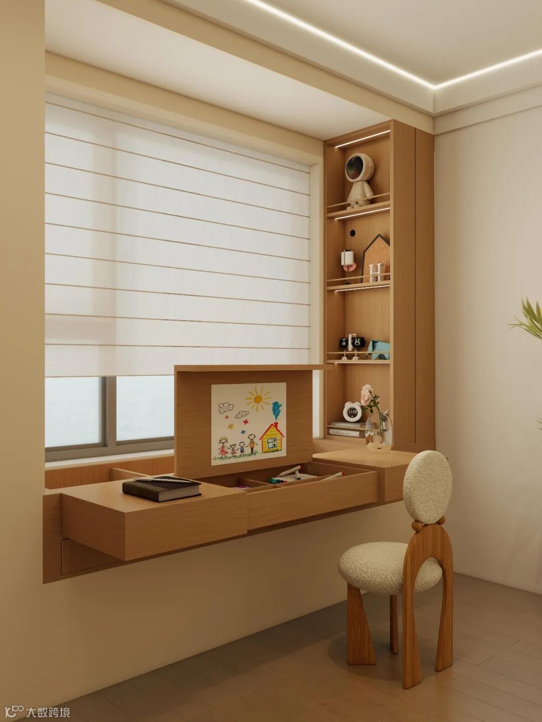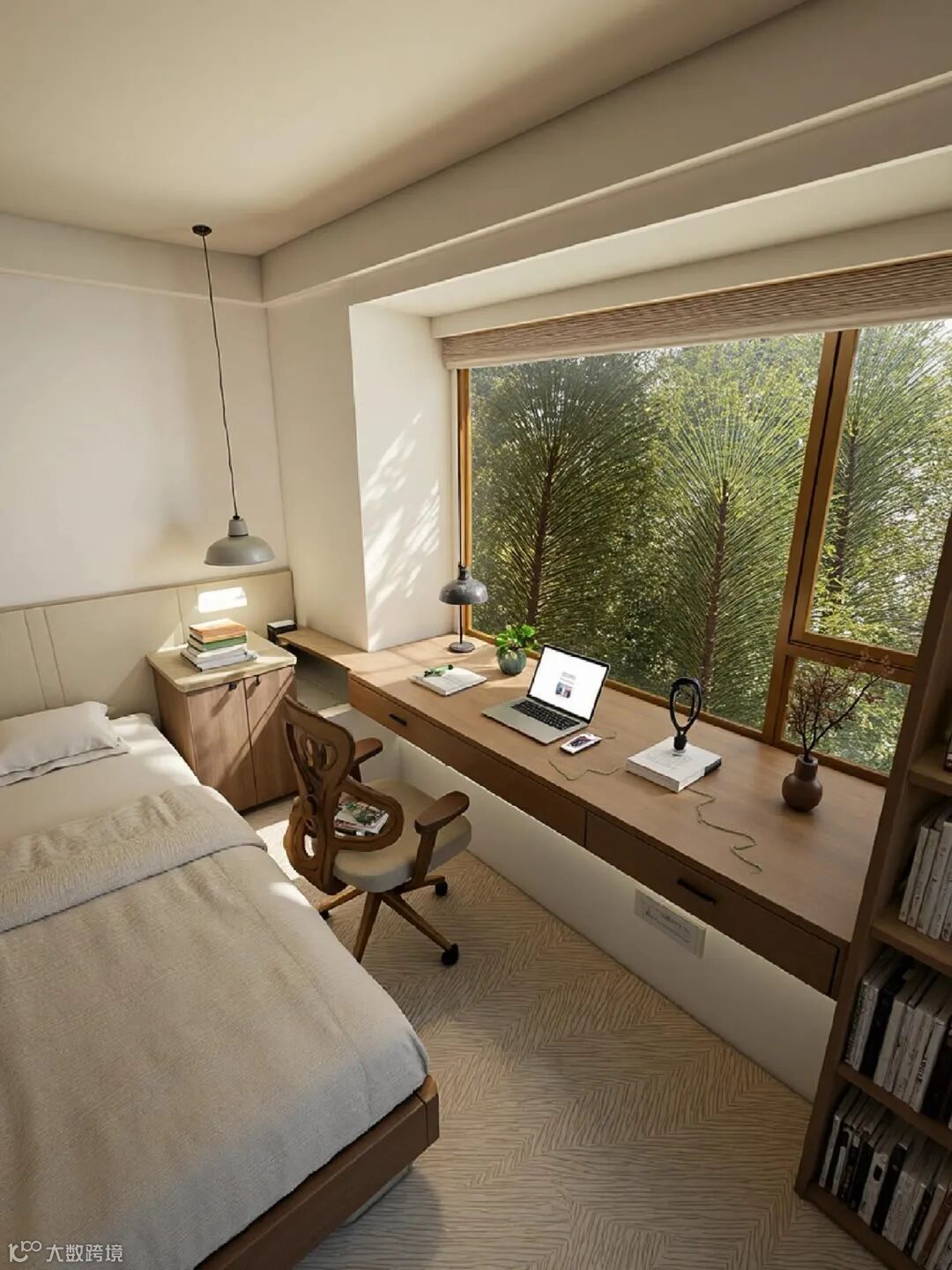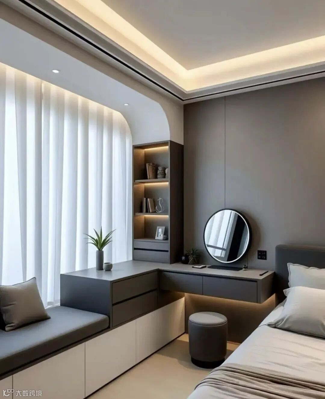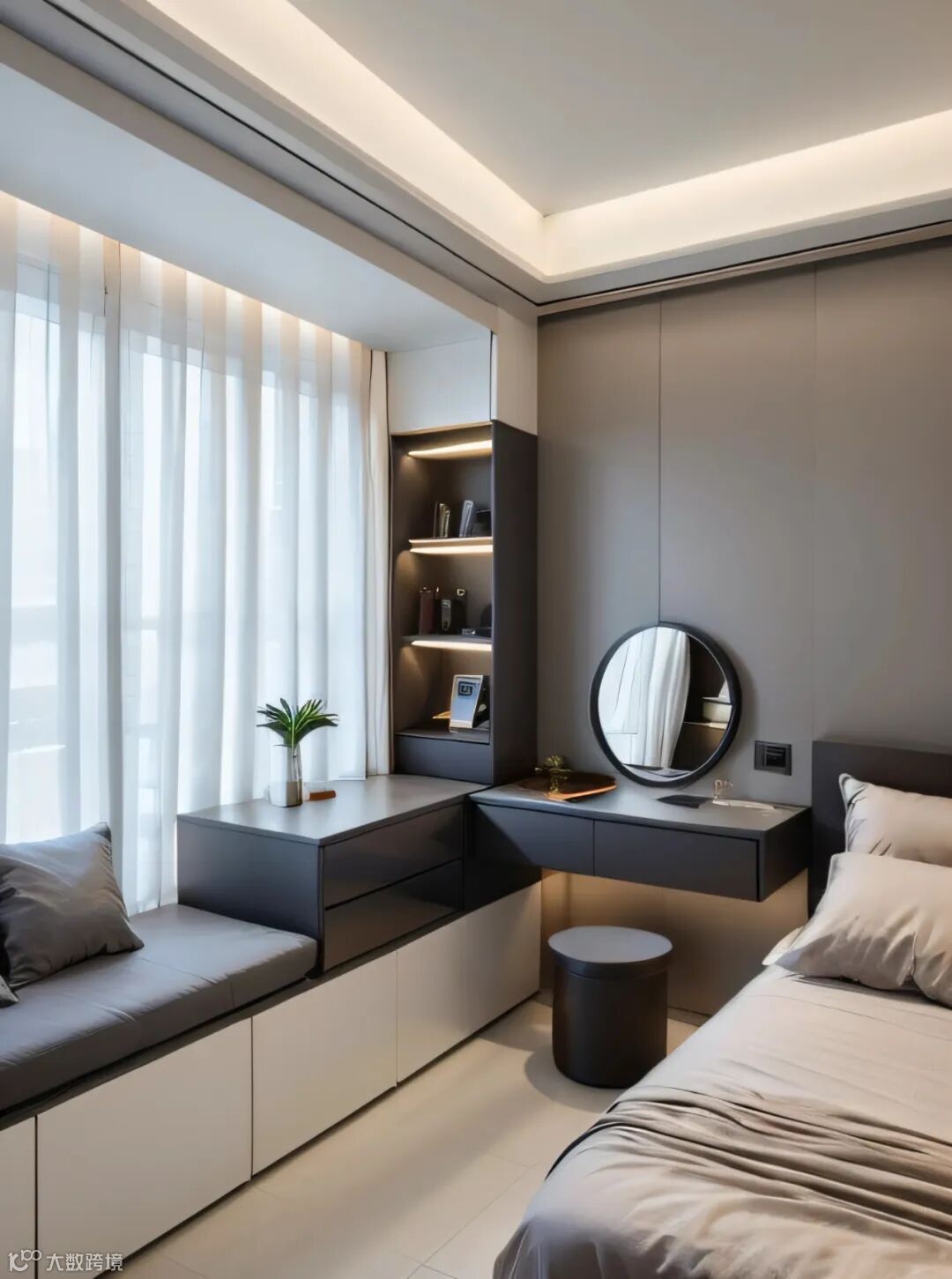 适用场景:飘窗面积小、床贴飘窗的卧室(儿童房、次卧),或层高较矮的户型。