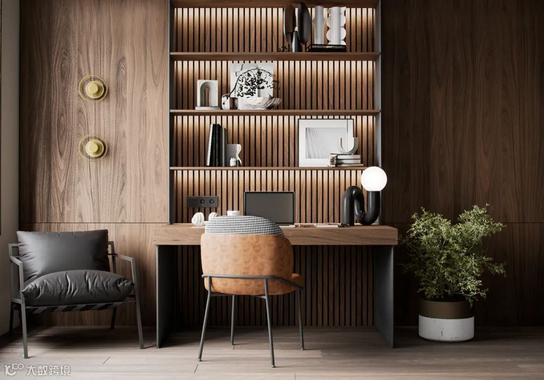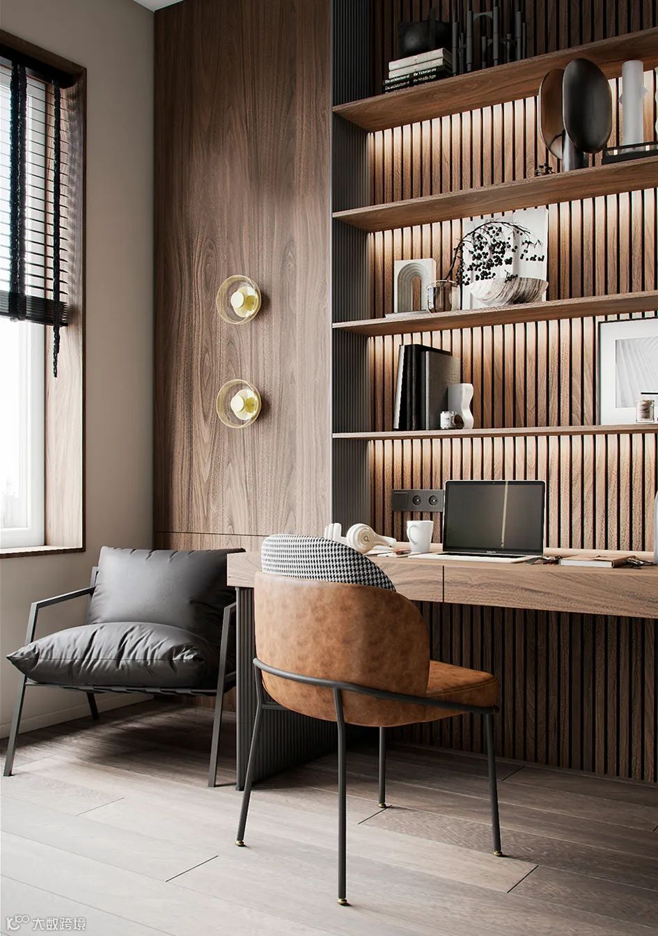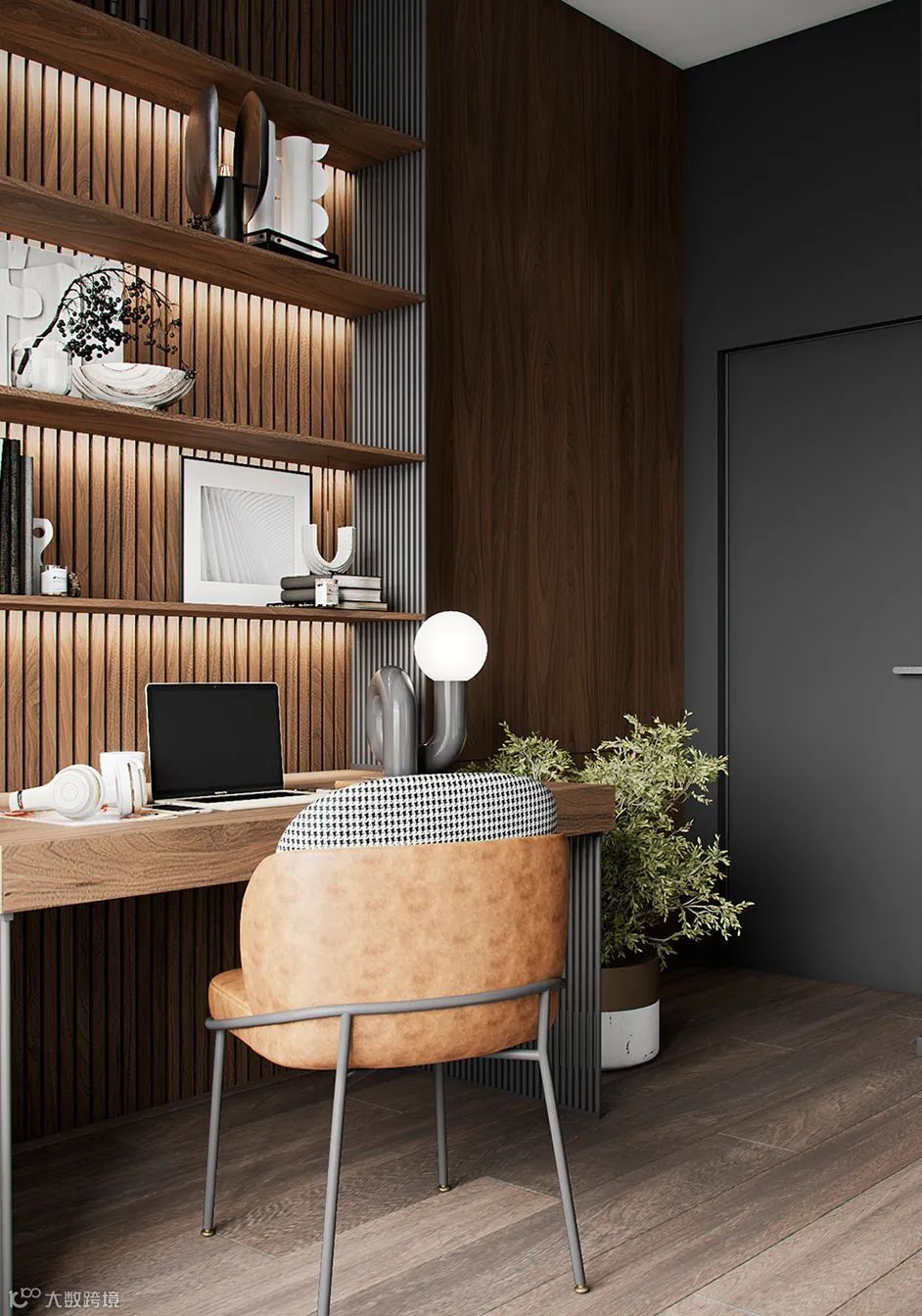 书房设计了办公区和休闲区,BODES办公区设计了书架和收纳柜,非常实用,藏光的设计更是为空间带来了一分格调。