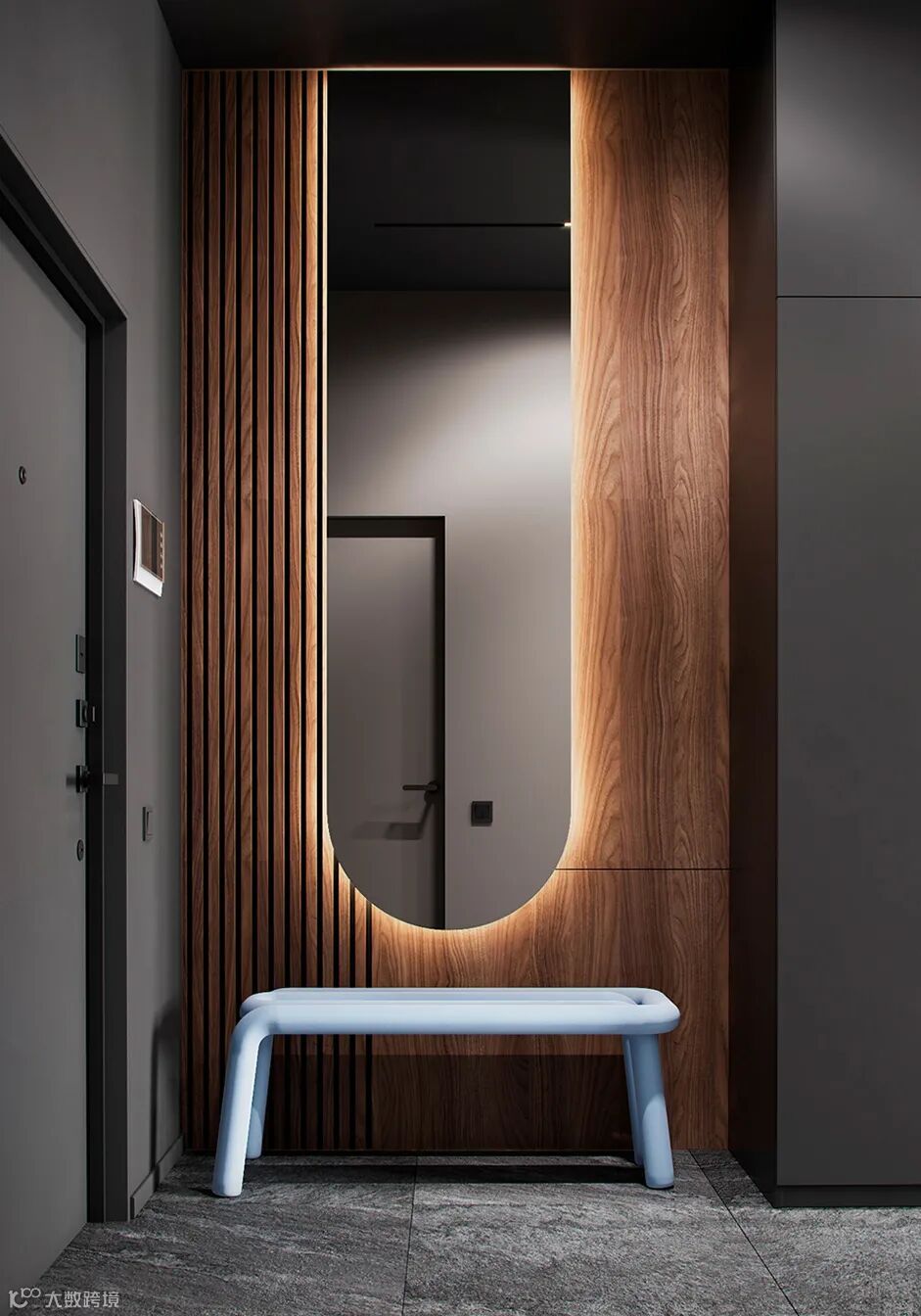 玄关设计师采用灰色石材地面和墙体,营造冷静理想的家居环境,浅蓝色的换鞋凳和原木背景格外醒目,通过光影让空间整体更统一。