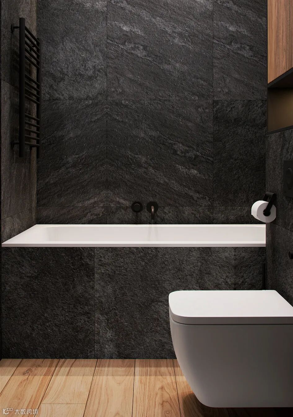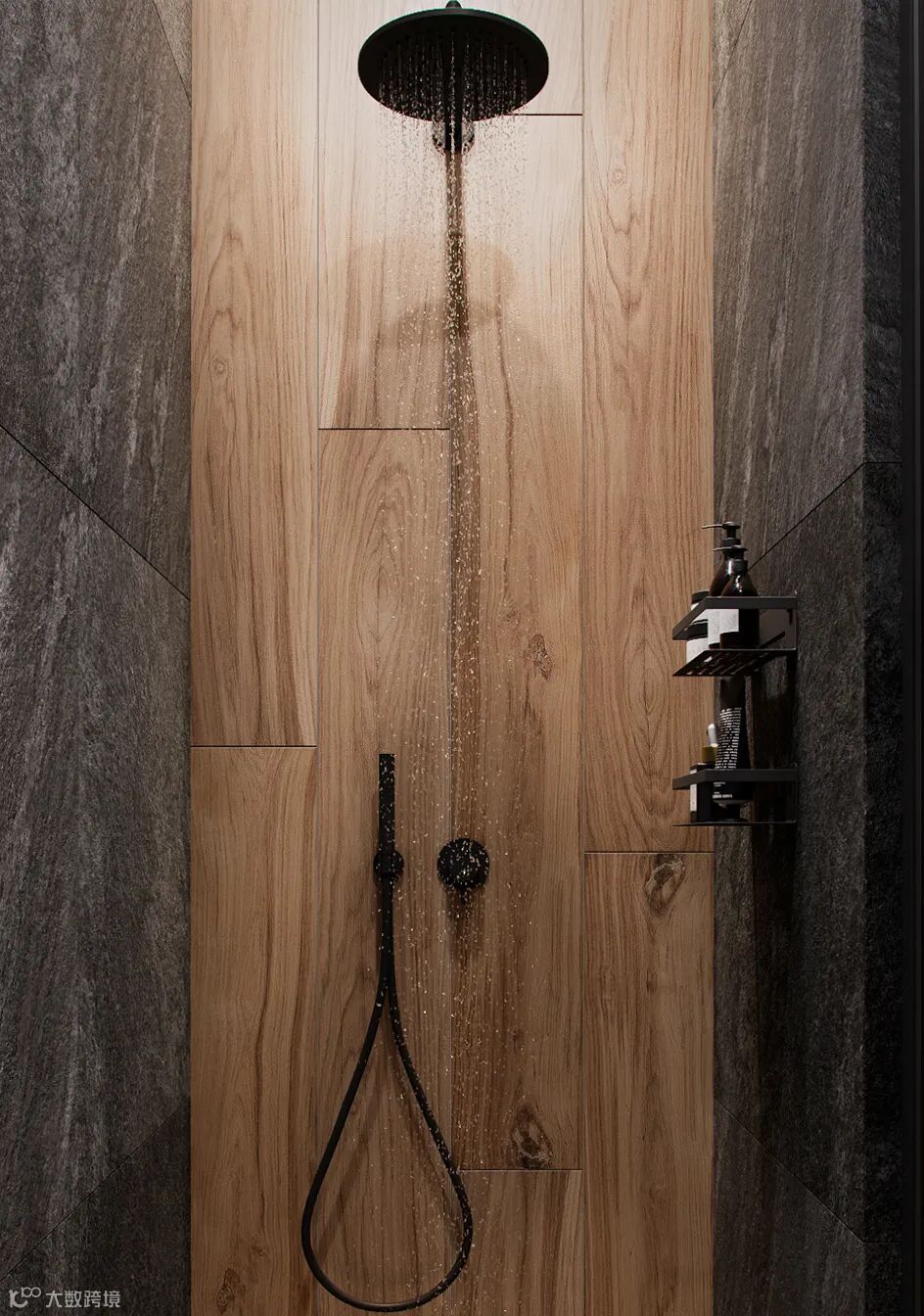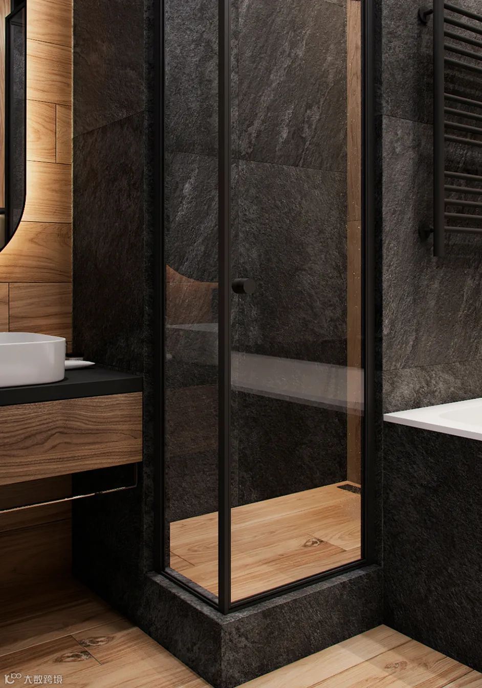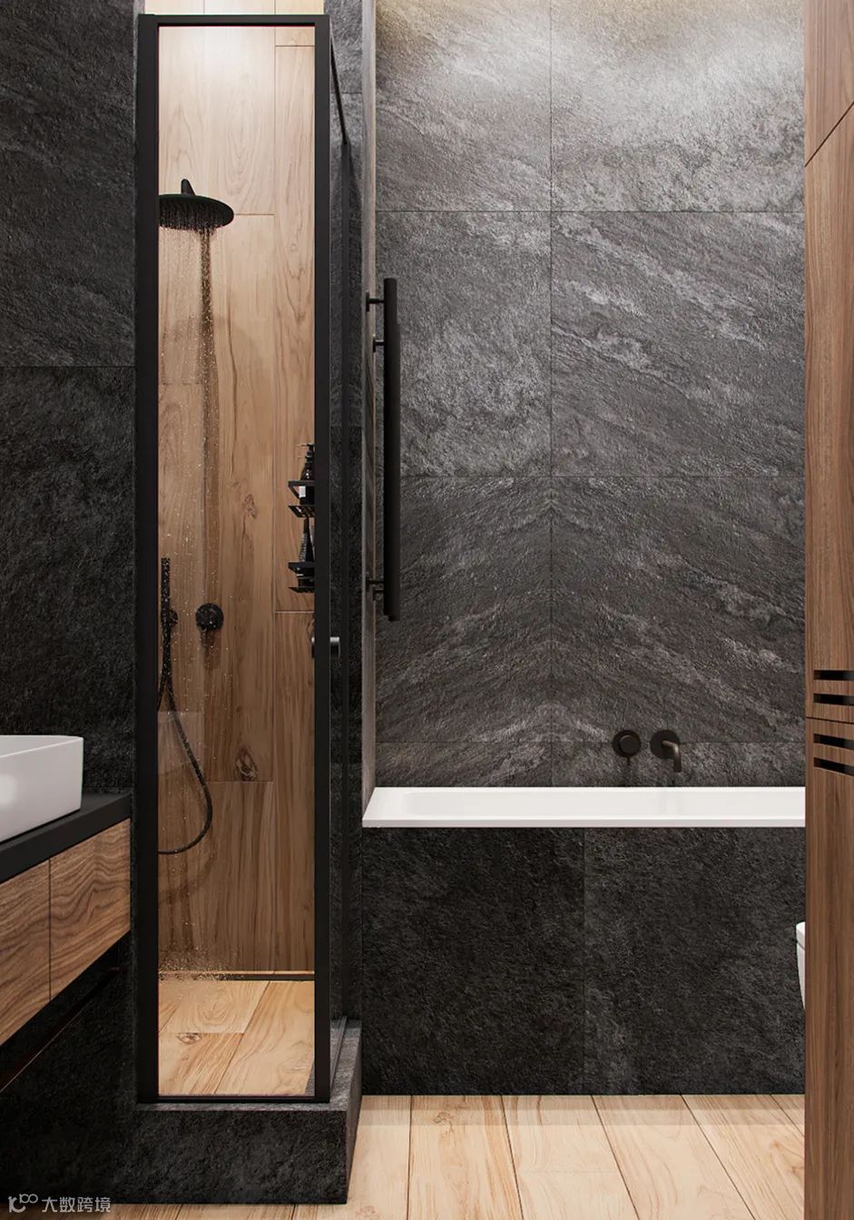 卫生间在注入原木的同时运用深灰色石材、玻璃,黑色边框的点缀让整个空间更宽敞、更有质感。