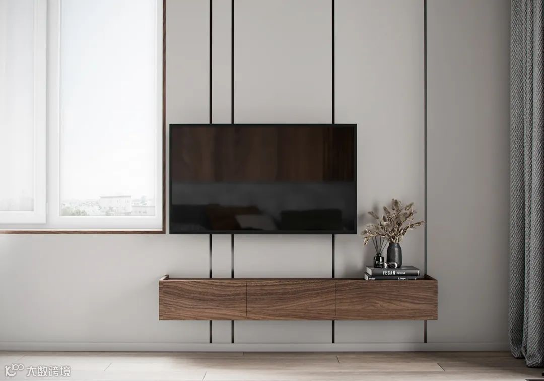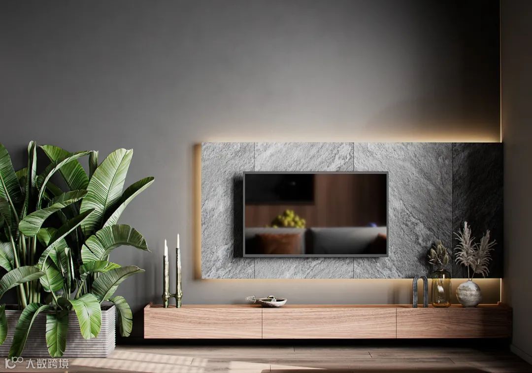 客厅空间不大,开放式的布局,通透明亮,灰色石材的电视背景搭配木色的电视柜,冷暖色调的对比,同时绿植的点缀,纯粹而又宁静的生活环境。