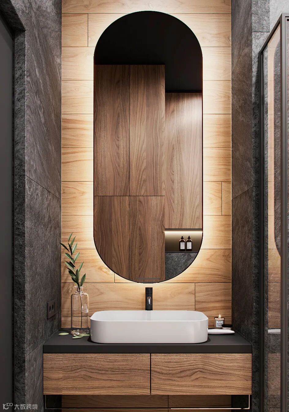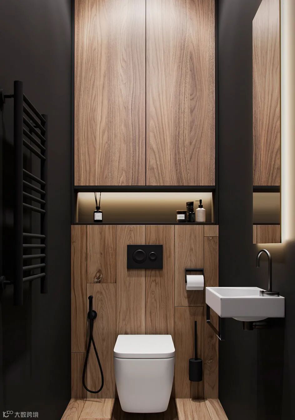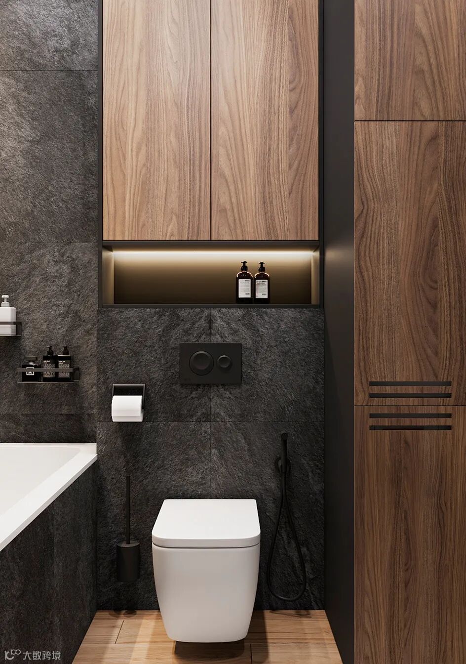 客卫深灰色和原木色为主,白色的洗手盘,黑色五金元素,BODES多了几分工业感,烘托了整个卫浴间的品味。