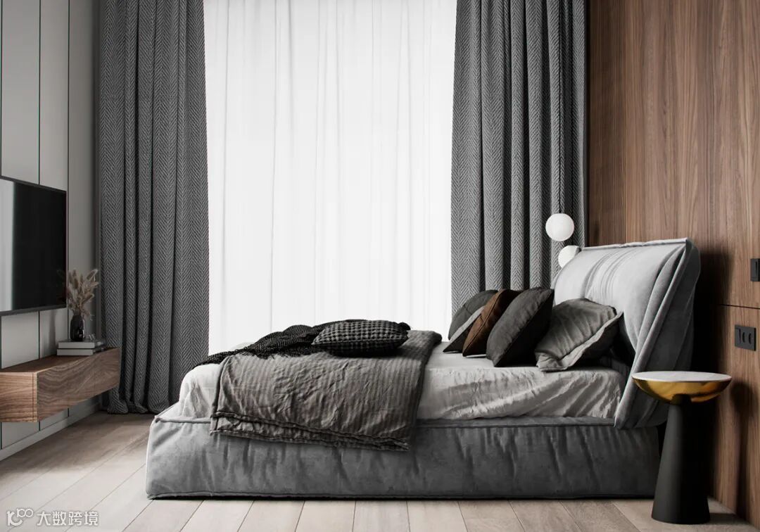 延续客厅的整体色调,主卧内优雅而又朴素的床,原木的床头背景搭配灰色床品,营造卧室幽暗静谧的舒适睡眠空间。