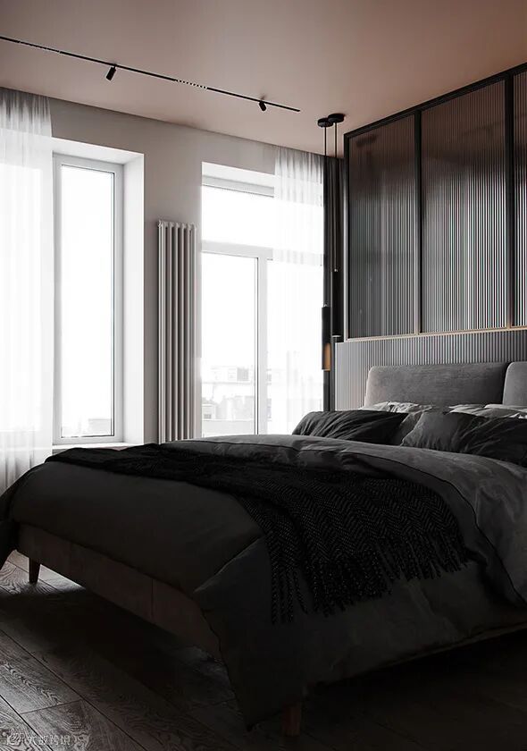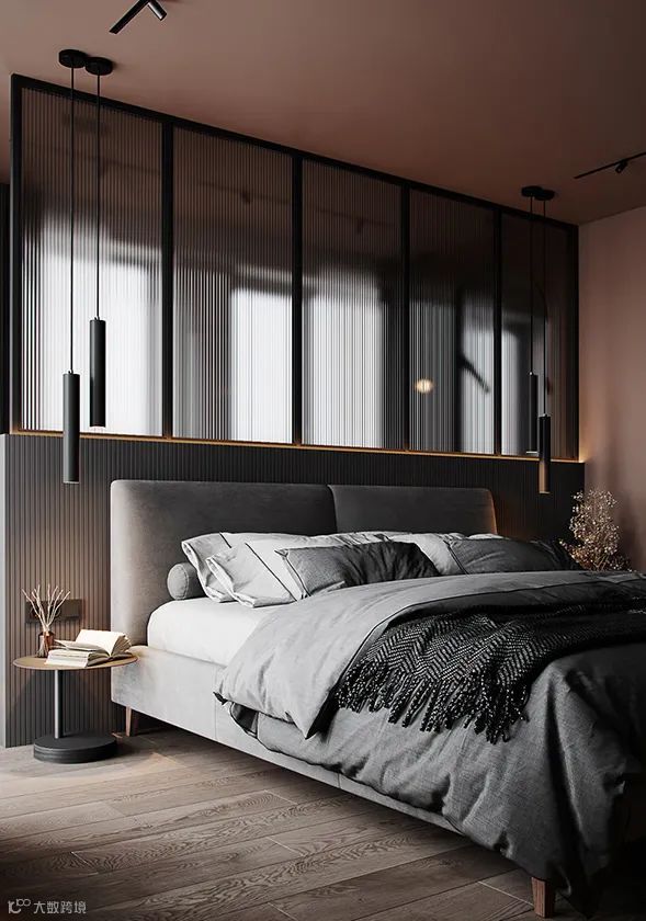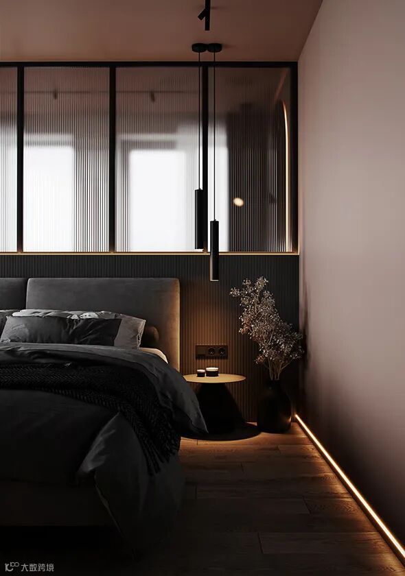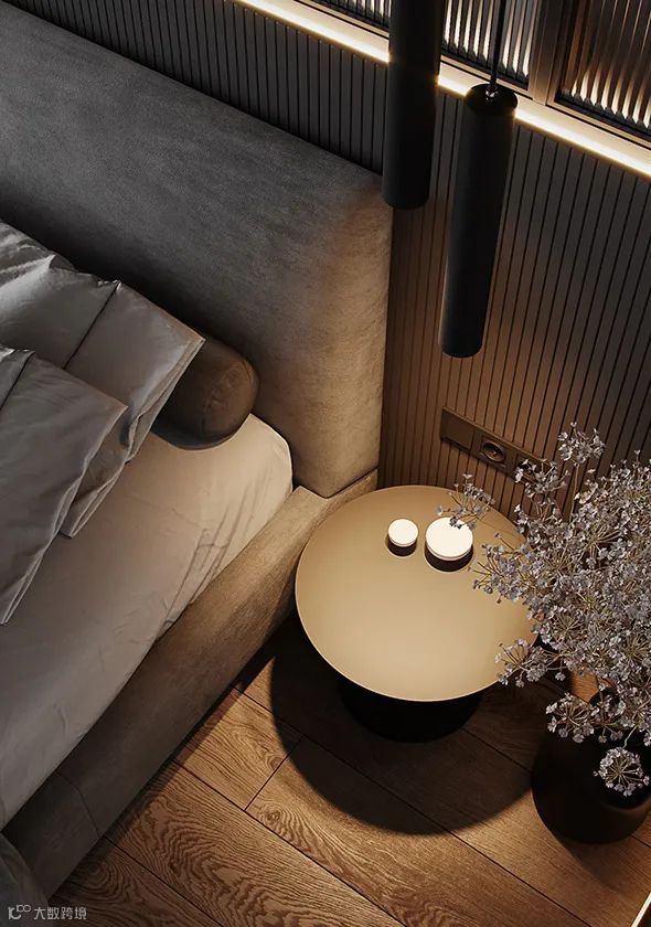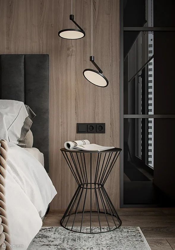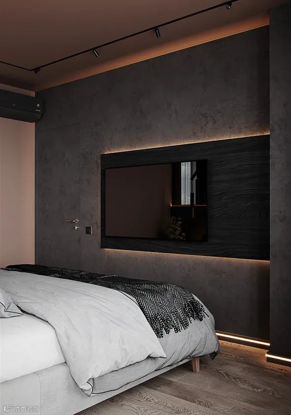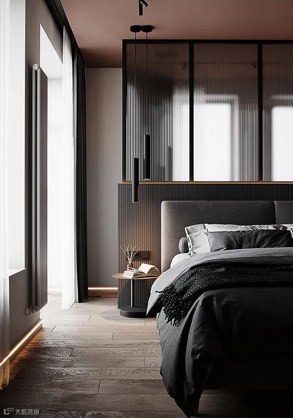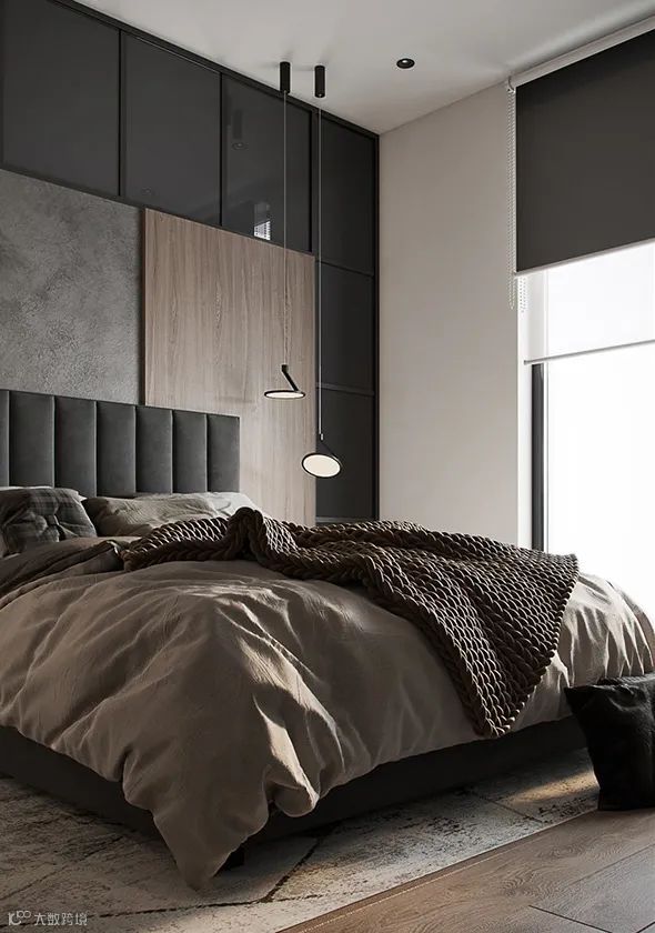 17㎡的主卧同样采用黑色灰色木色为主,柔和的灯光,温馨舒适,一种优雅、宁静的高级美。