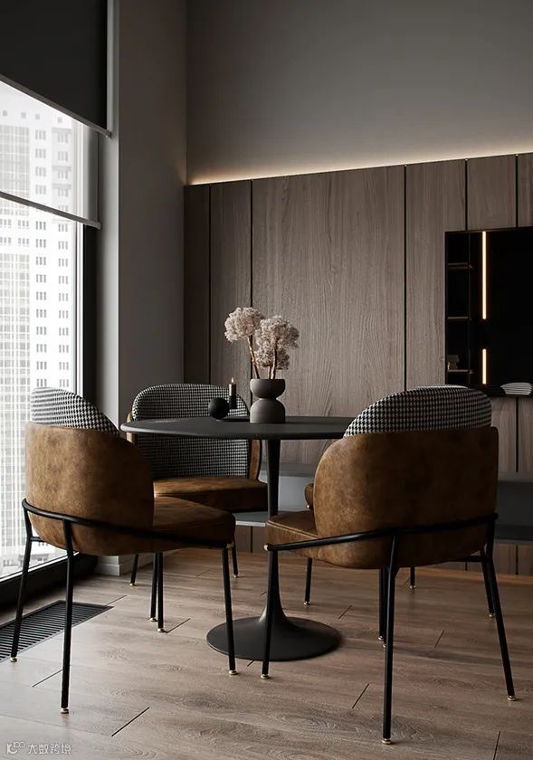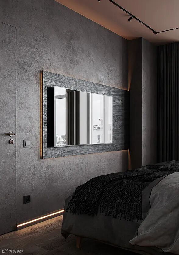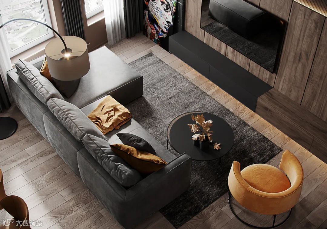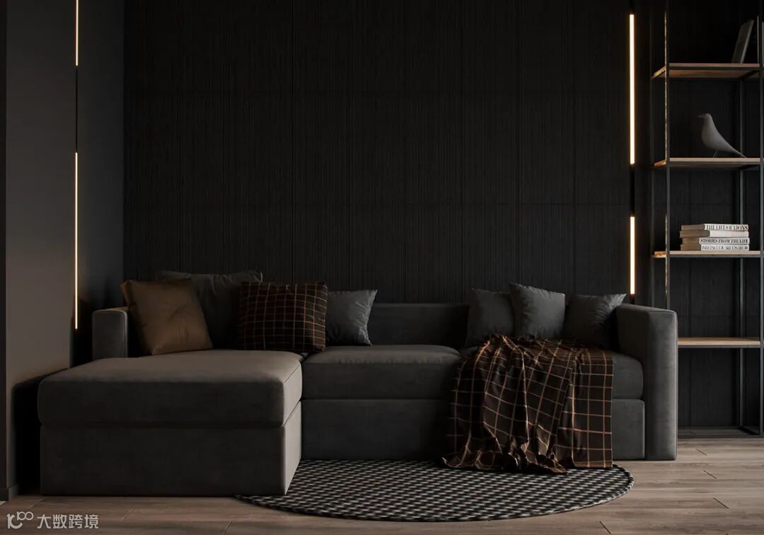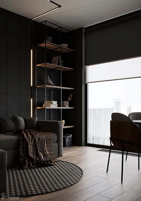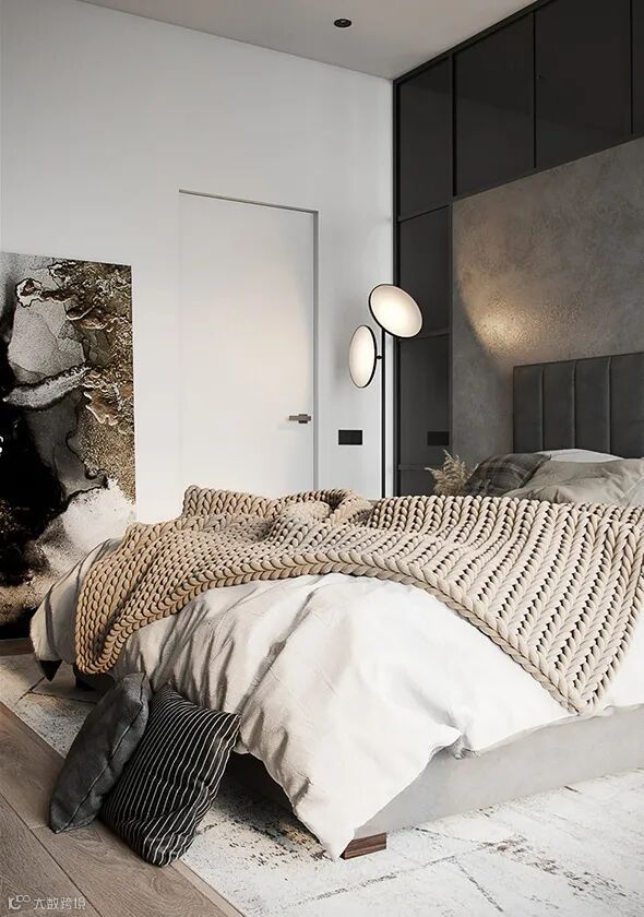 17㎡的主卧同样采用黑色灰色木色为主,柔和的灯光,温馨舒适,一种优雅、宁静的高级美。