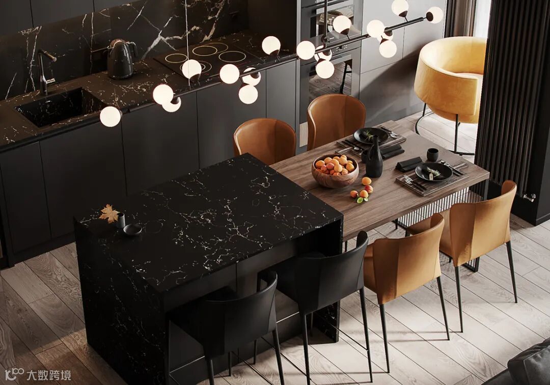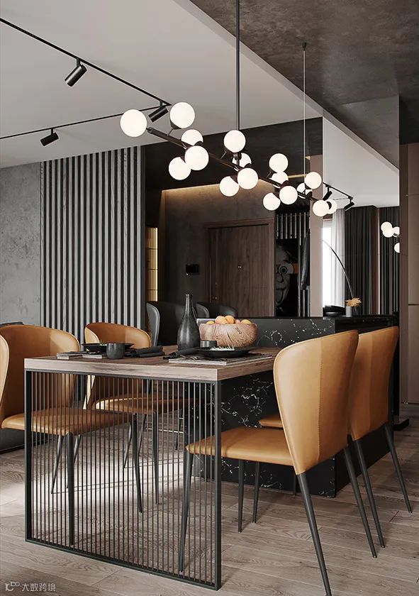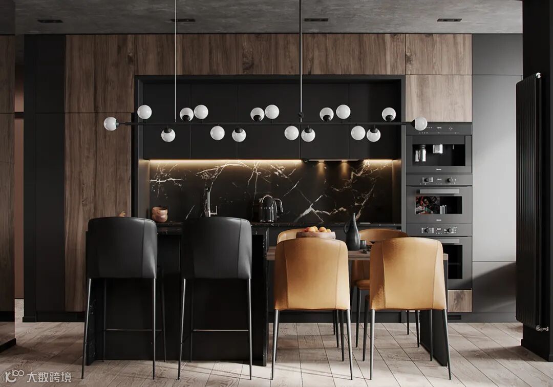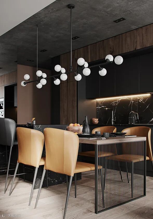 奢华的餐厅厨房一体化的设计,黑色橱柜和原木色搭配黑色大理石台面充满着干净卫生的风格,在这里享受做菜的乐趣。加上中央岛台黑色台面与实木餐桌一体搭配上黄色的座椅带给你轻松美妙的体验和享受,大气的风格充裕。