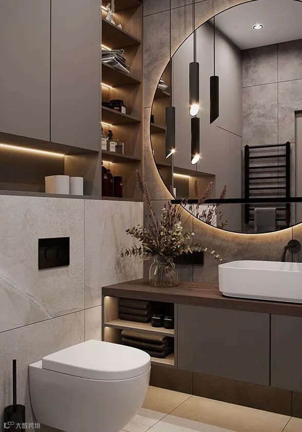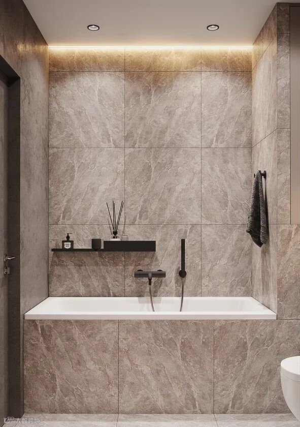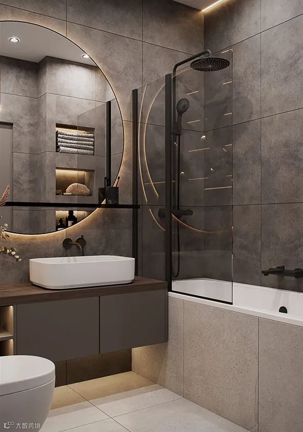5㎡的卫生间以灰色大理石铺设,悬空式的洗手台,马桶、花洒、浴缸一应俱全,其中马桶和浴缸都是白色和灰色的墙面非常搭配。