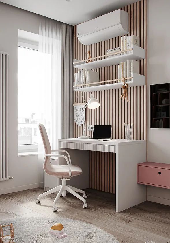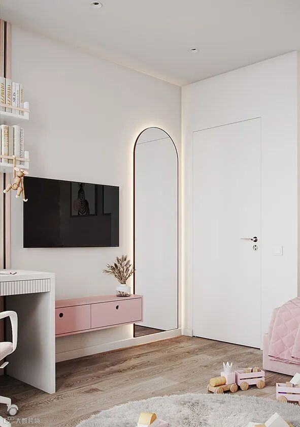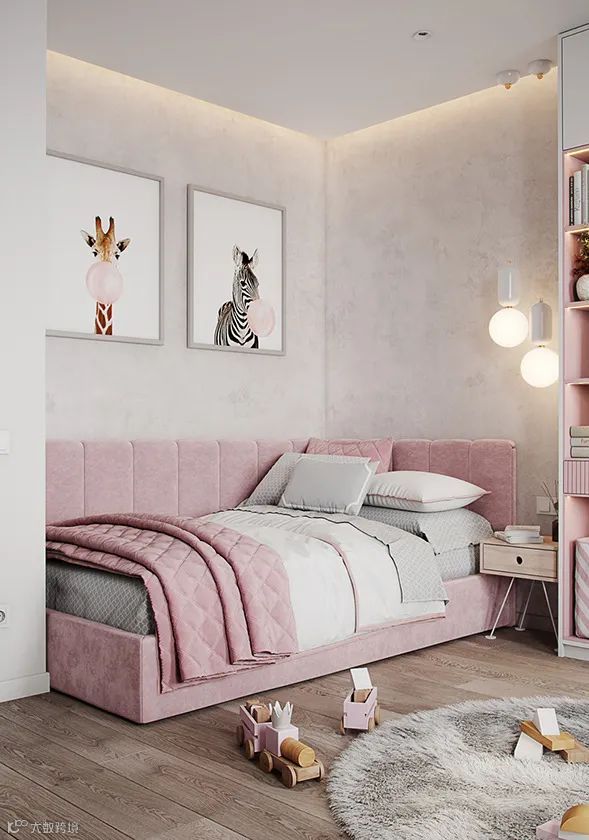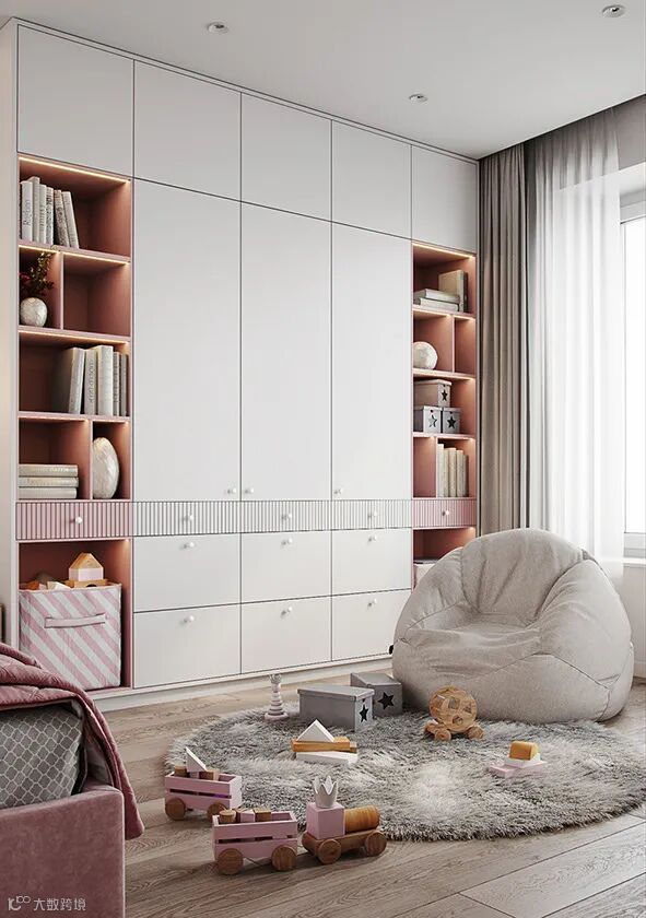 14㎡的女儿房,浅浅的粉色搭配柔和暖白,营造温柔的氛围,设计师将空间划分为了四块区域,依次是收纳区,学习区,娱乐区和休息区。