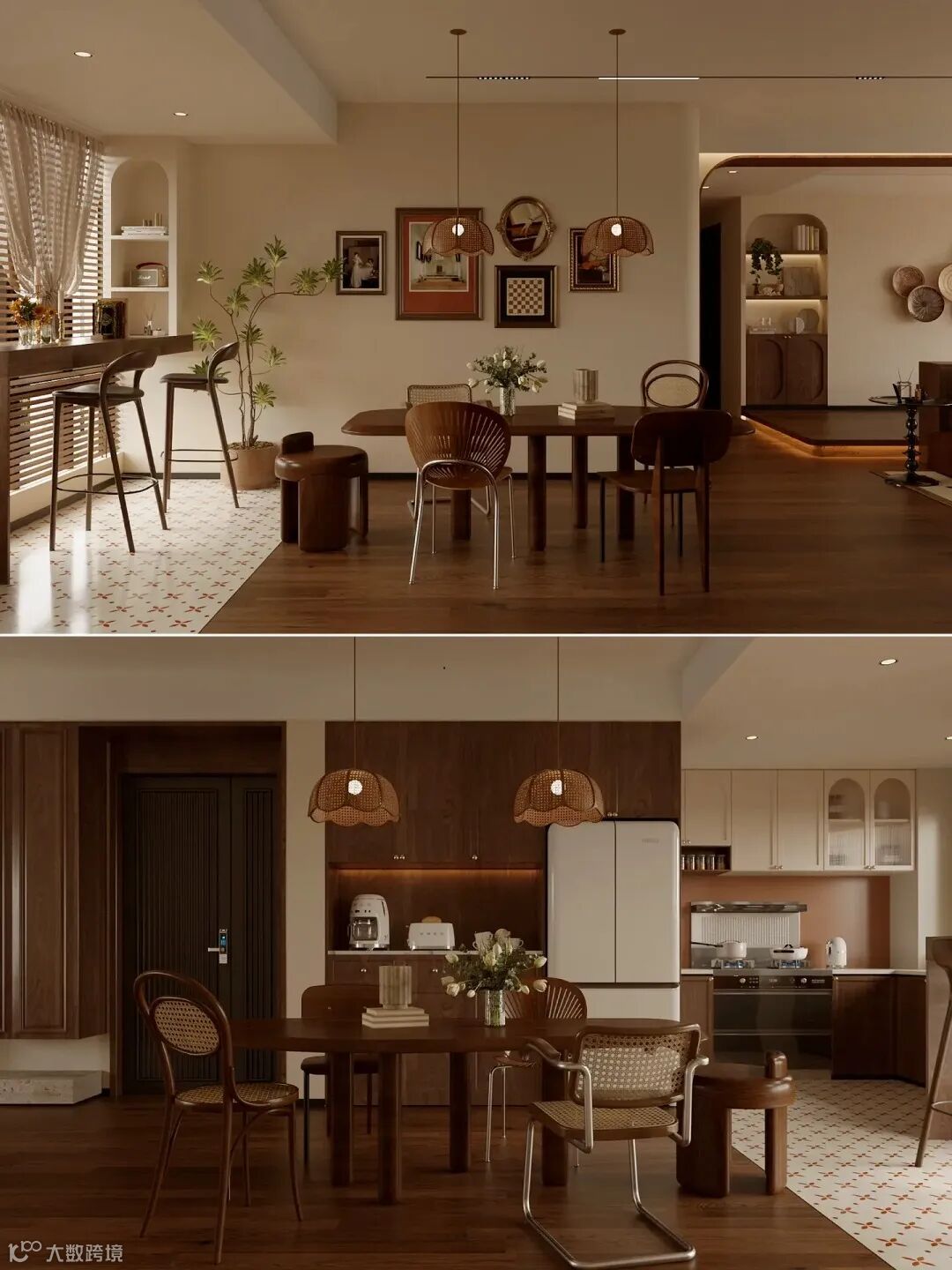 棕色焦糖餐厅是七分熟。焦糖棕+原木色完美谱写“秋日美拉德风”,深浅交错,勾勒出生活的质感。
