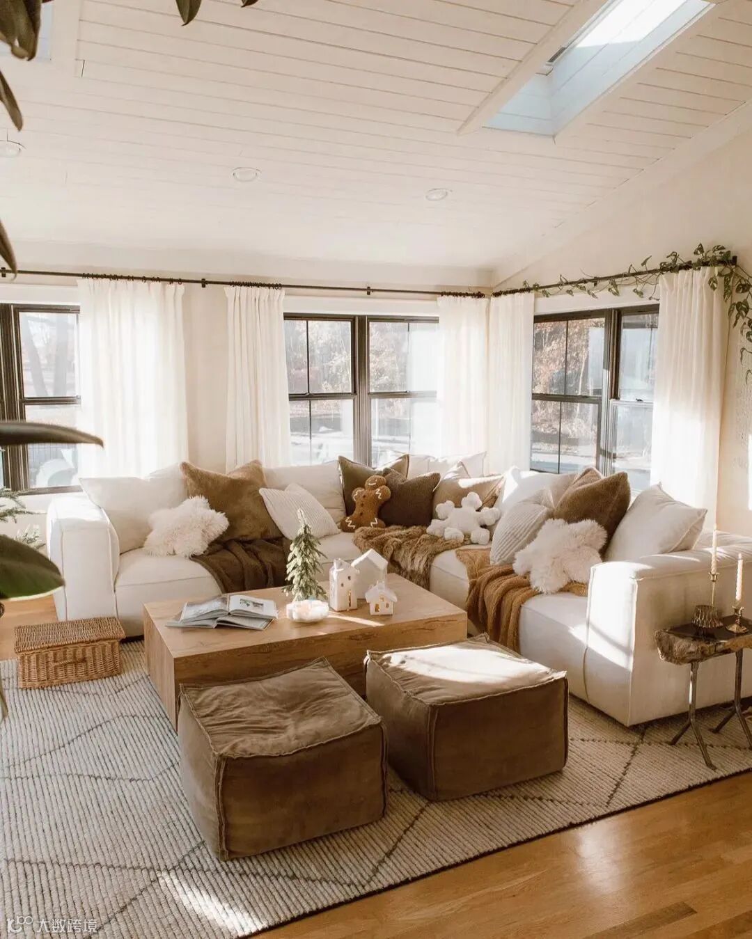 棕褐色、焦糖色在家中的巧妙搭配,缓解了秋日的丝丝凉意,试想一下坐在柔软的毛绒垫上,吃着温热的烤红薯和糖炒栗子,秋日氛围感不就来了吗?天然的复古调调给人一种温暖融合居家体验!