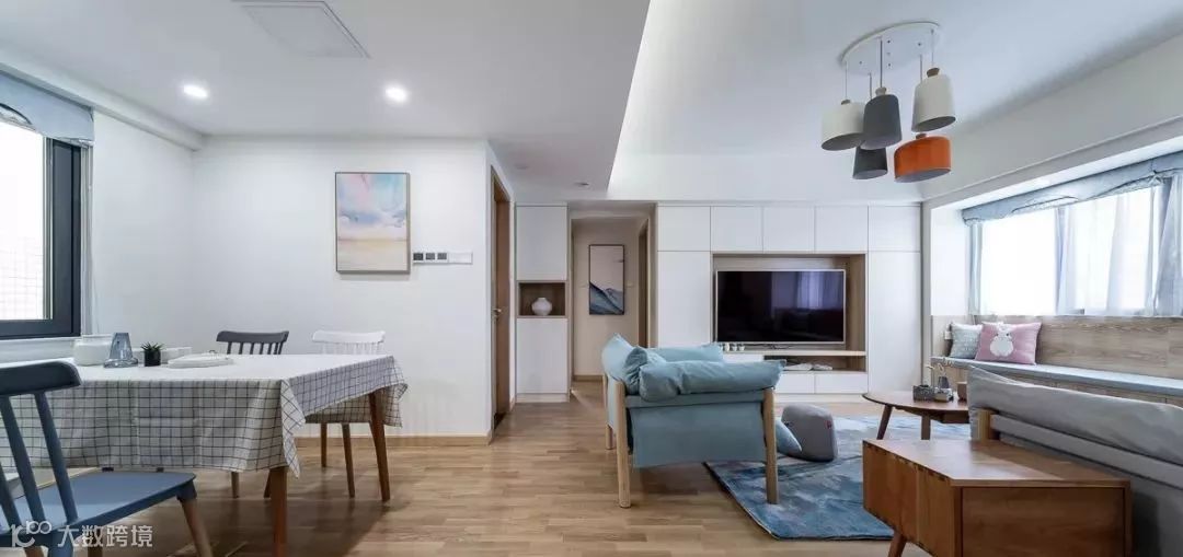 客厅与书房开放式设计,视野很开阔。白色墙面柜体搭配原木家具、地板,格外的自然清爽。