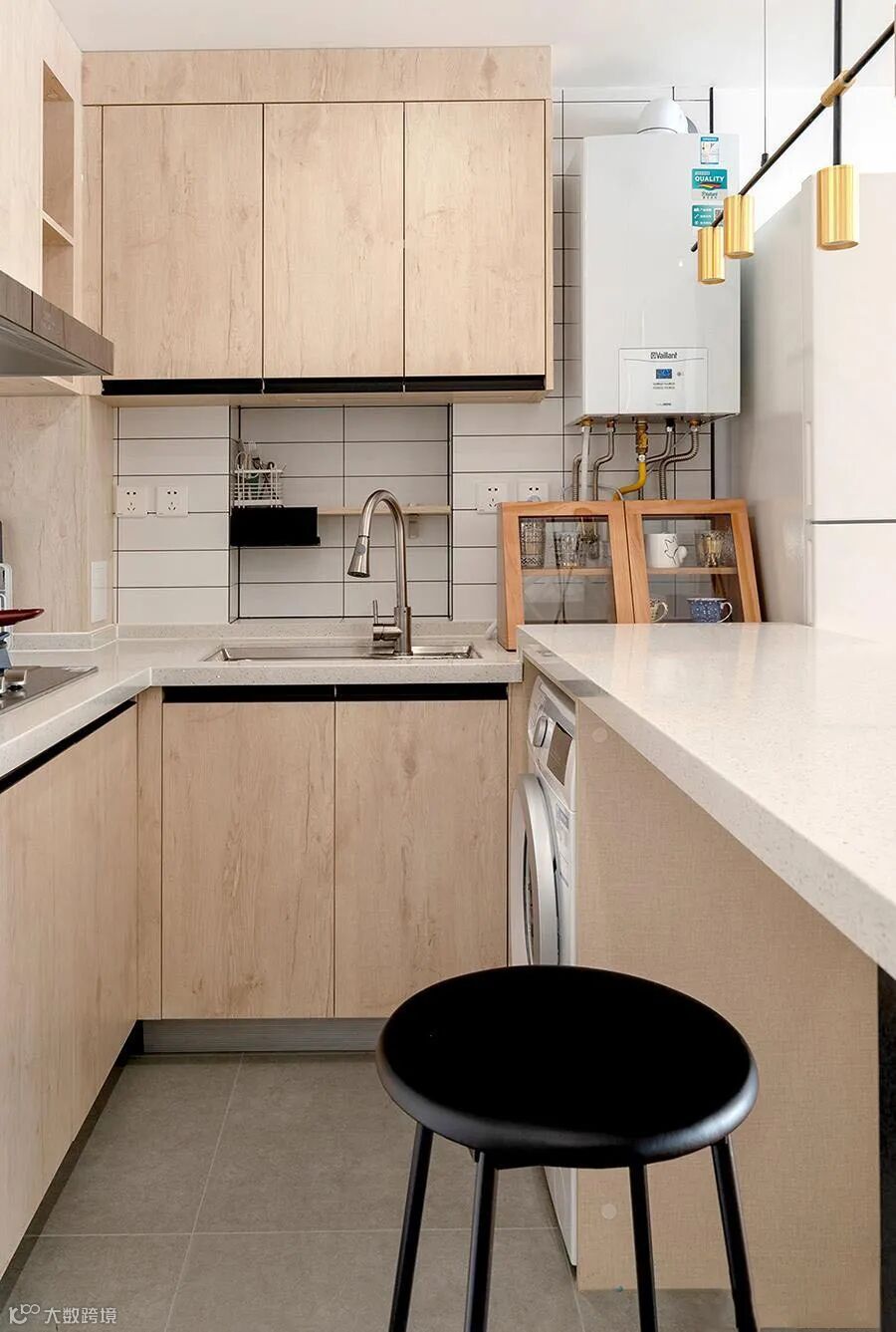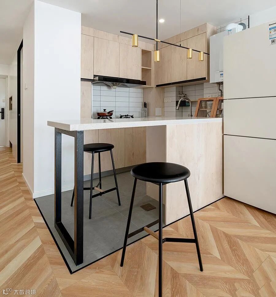 餐厨一体化设计,充分利用空间,使用也很方便。白色、浅木色和黑色搭配,年轻人最爱的简约大气风。