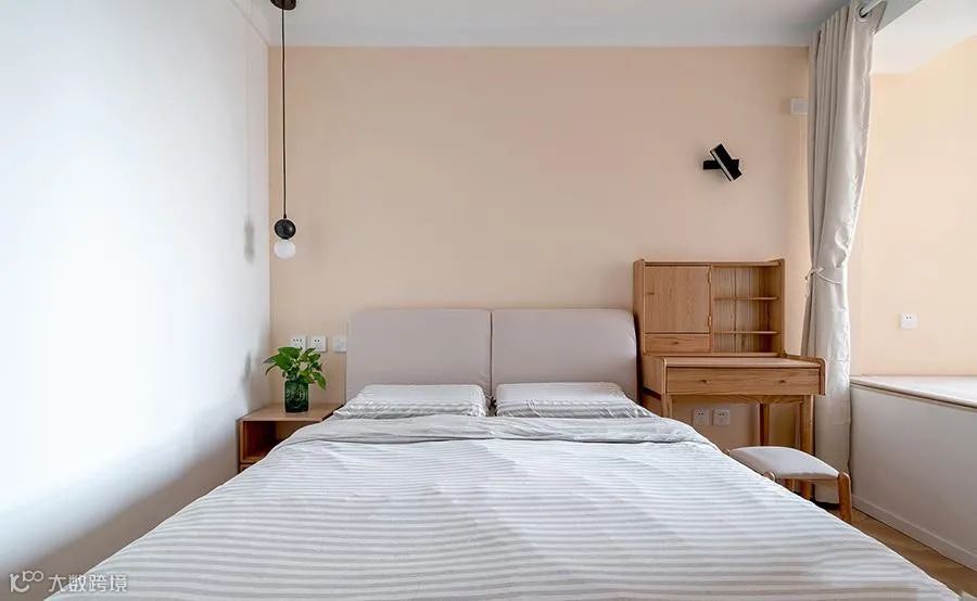 卧室位于玄关鞋柜后方,看起来简单干净。靠墙放置衣柜,满足储物的需求。双人床看起来极其舒适,条纹色的床上用品整洁又干净。床头左侧是床头柜,右侧是梳妆台,原木质感温润。