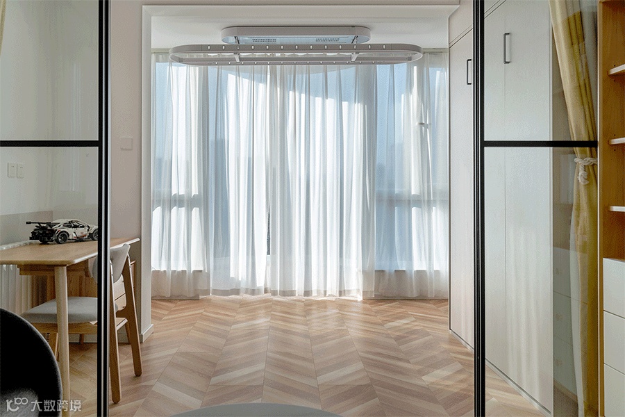 多功能房和阳台相连,采光充足。阳台上方安装电动晾衣架,旁边柜子增加储物功能,纱帘设计营造浪漫氛围。
