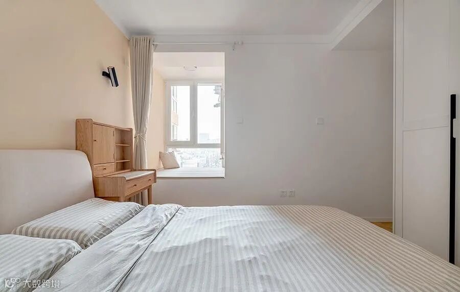 将原来的小阳台纳入卧室空间,虽然只有一扇小窗户,但光源充足,清新明亮。窗台兼具收纳和休闲的功能,实用极了!