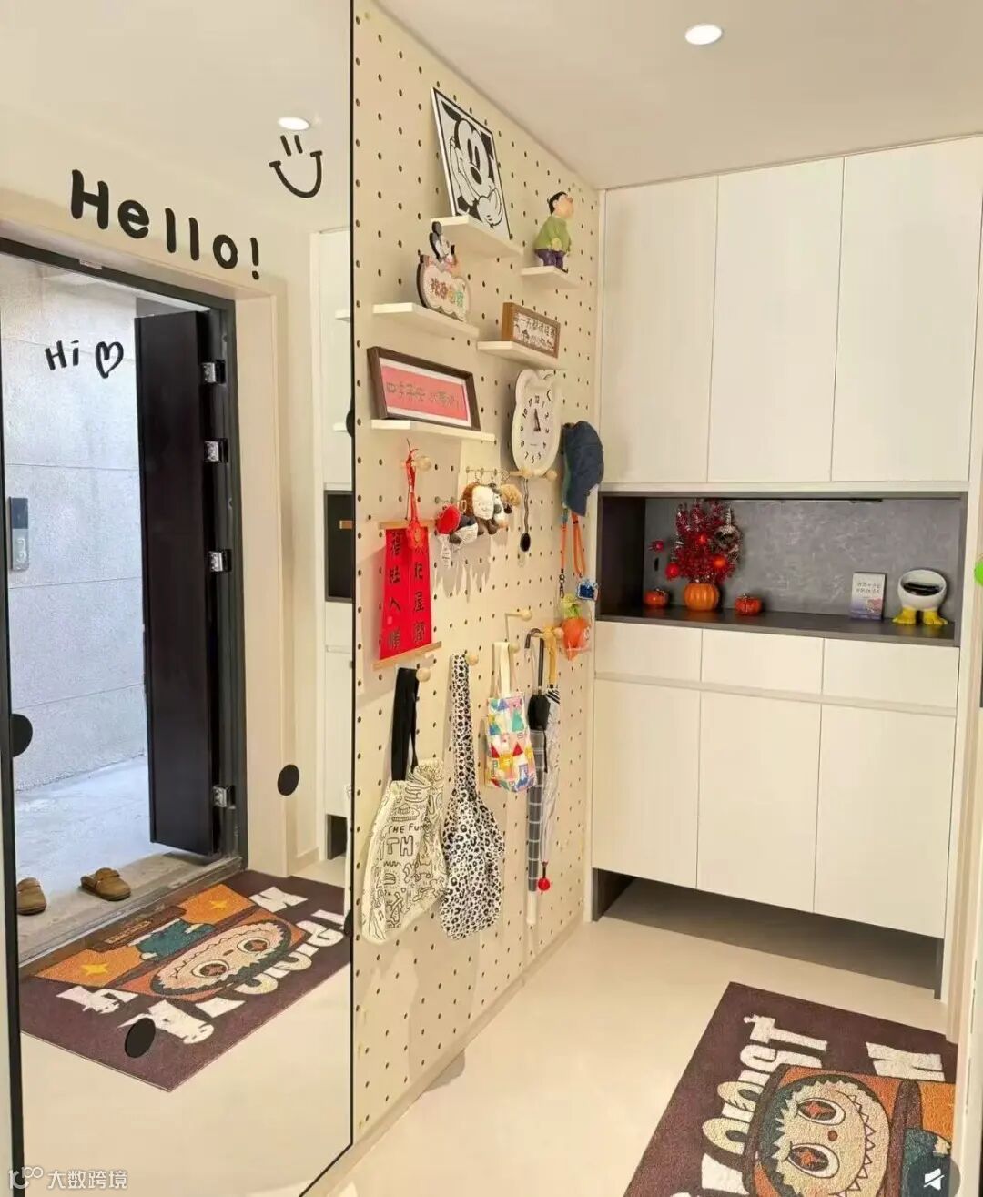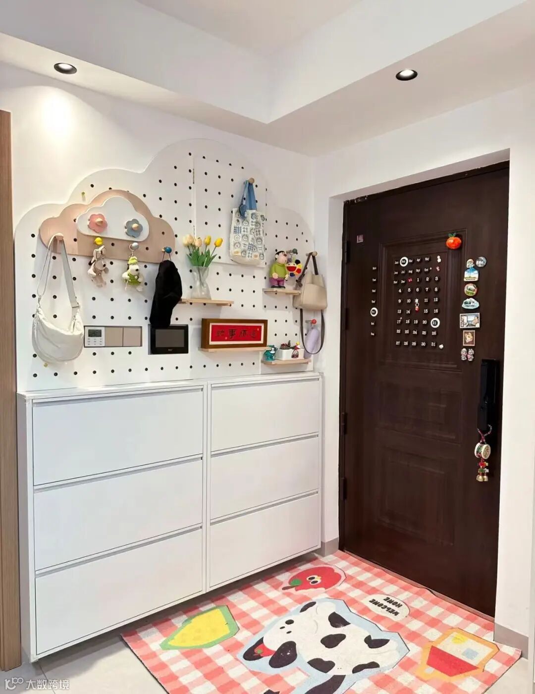 同时,不要忽视墙面空间的利用。安装挂钩用来挂外套、帽子、包包,再搭配洞洞板,可将雨伞、钥匙等小物件有序收纳,让玄关告别杂乱,保持整洁有序。
