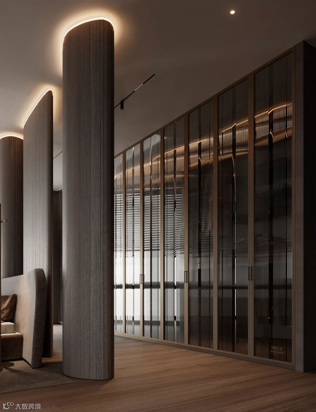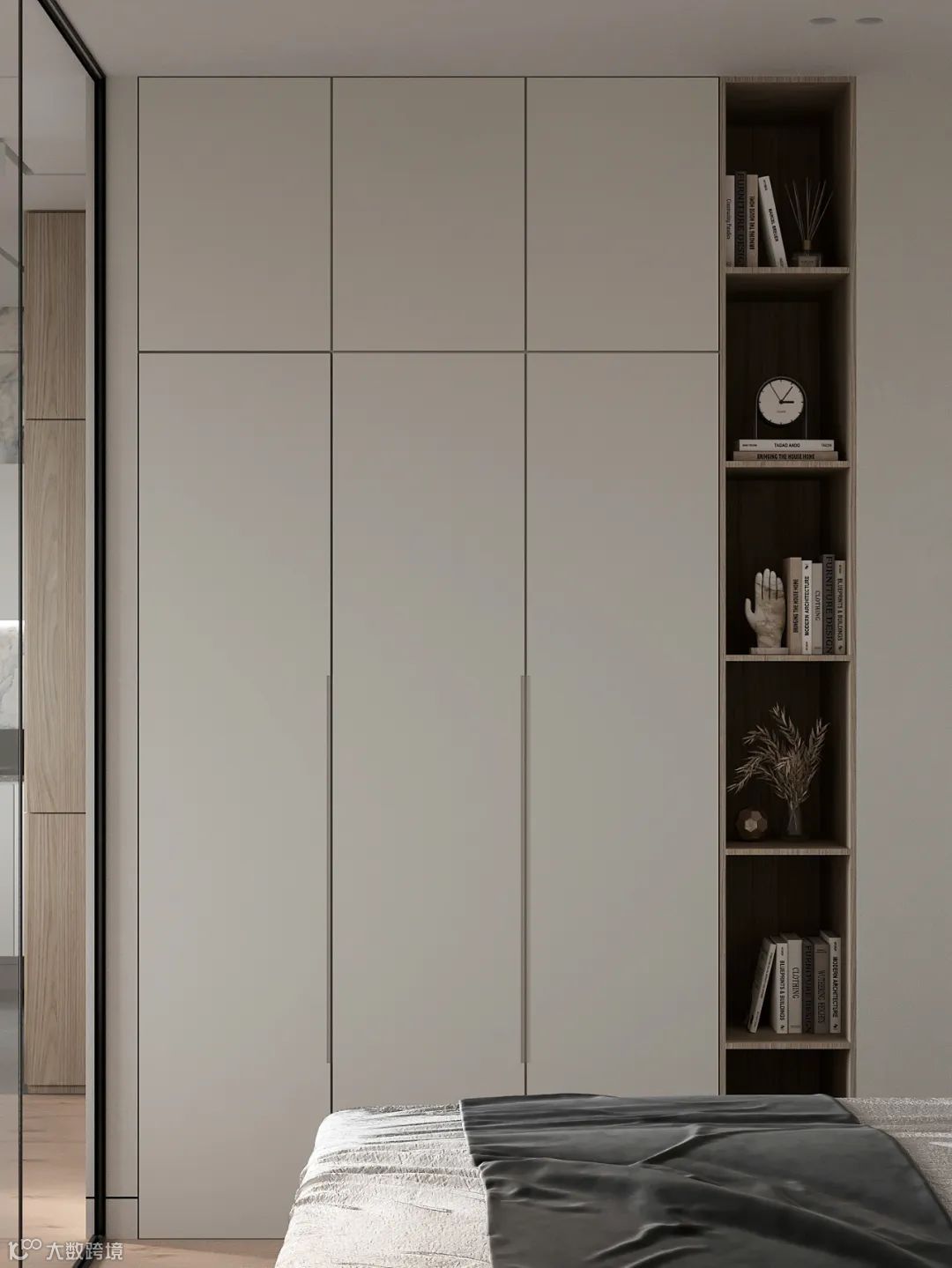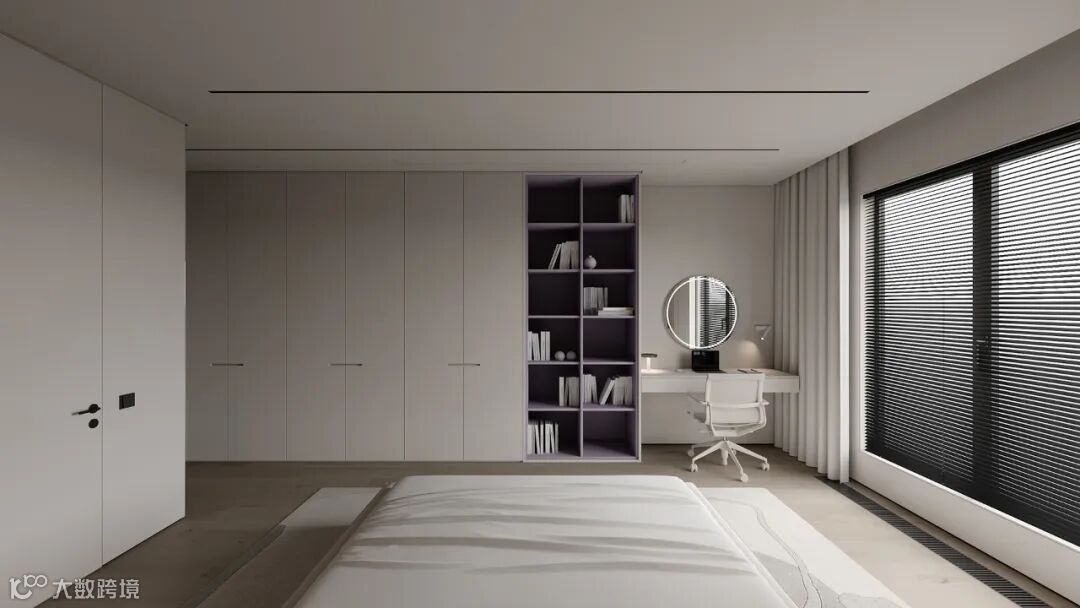 定制衣柜搭配玻璃门,自带优雅的属性,让空间呈现精致的高级范,玻璃的通透视感,瞬间点亮了整个卧室。