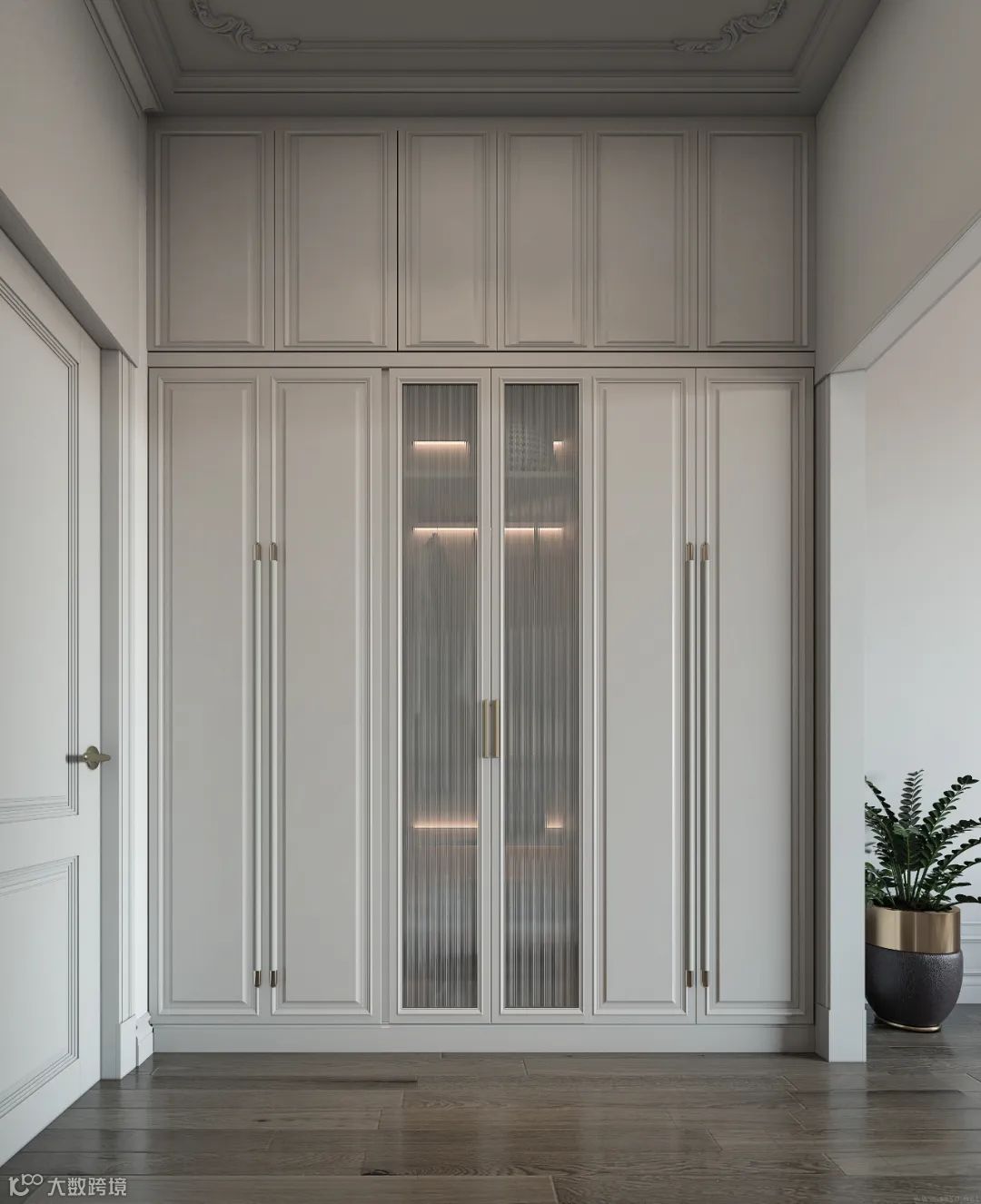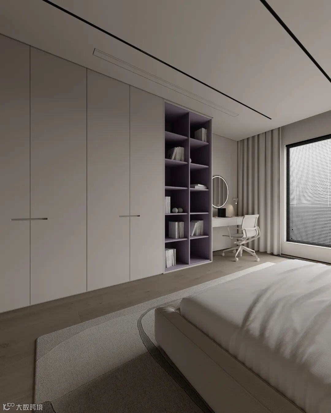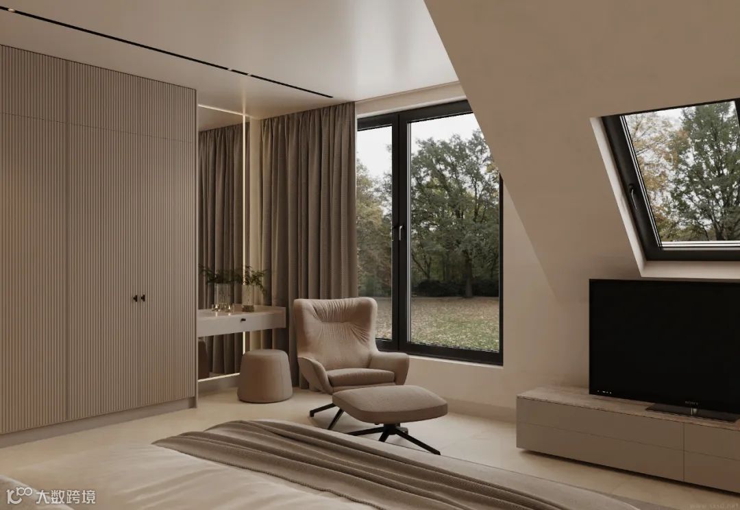 定制衣柜搭配玻璃门,自带优雅的属性,让空间呈现精致的高级范,玻璃的通透视感,瞬间点亮了整个卧室。