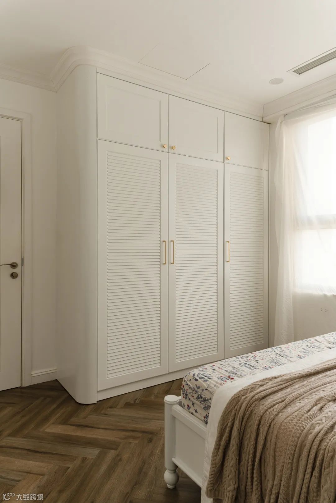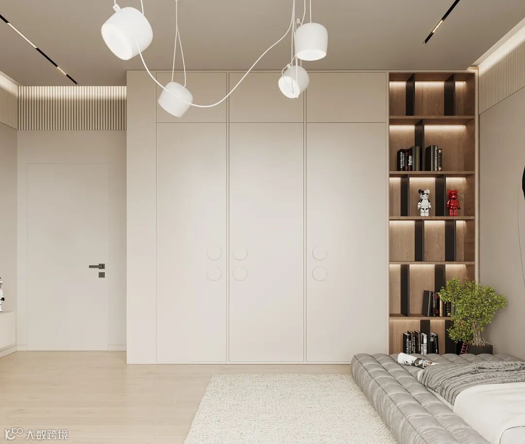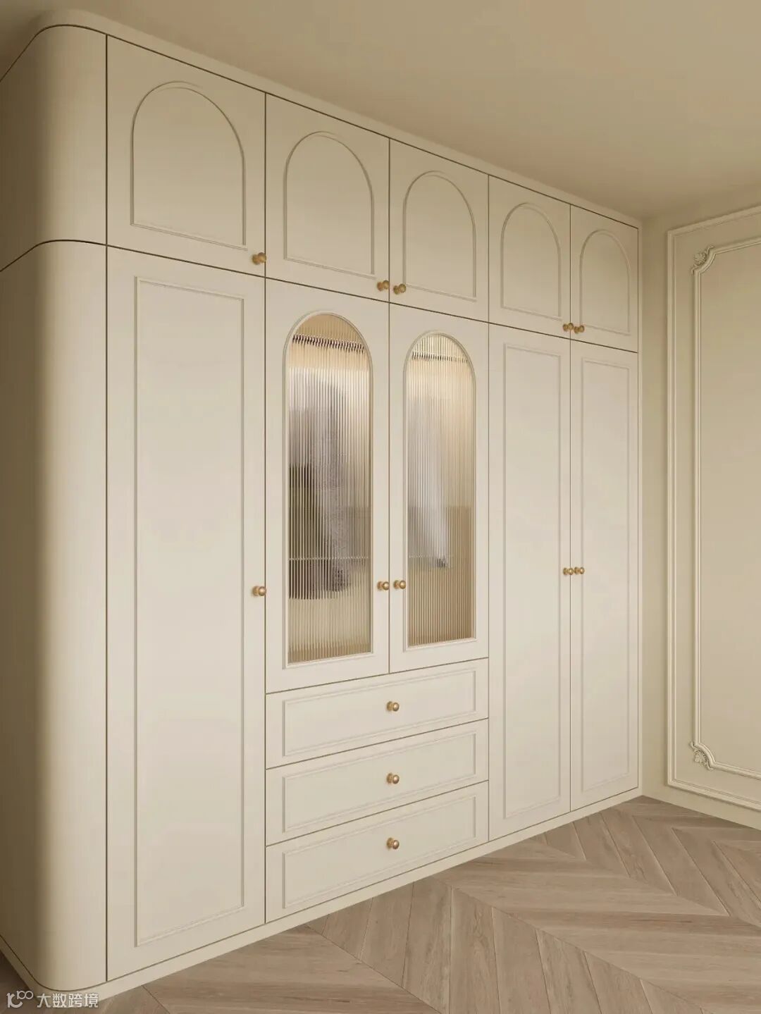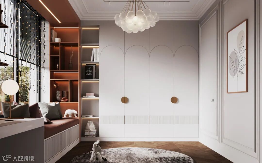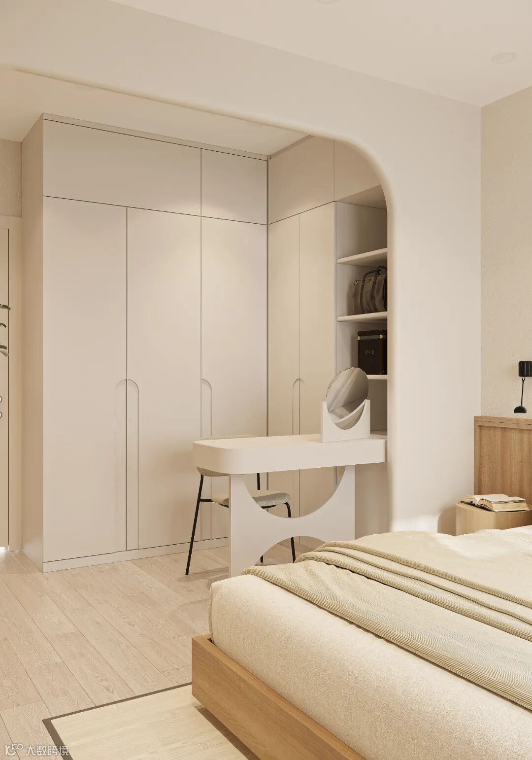 定制衣柜设计个弧形转角,颜值更高,不仅能够防止磕碰到,也为空间带来了更多的艺术感,营造出温馨个性的家居氛围。