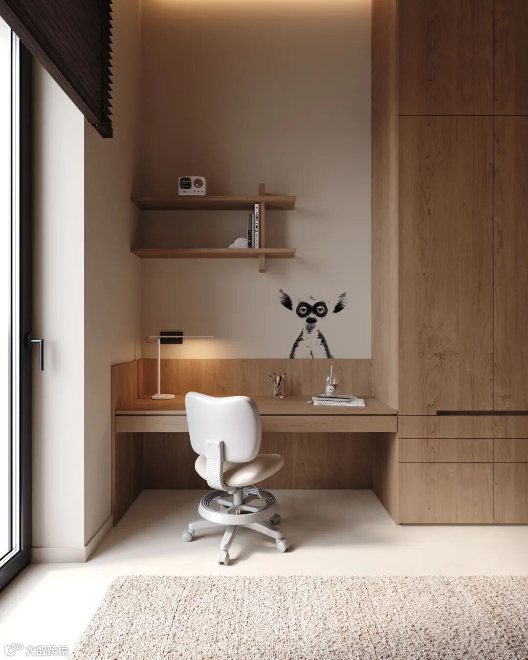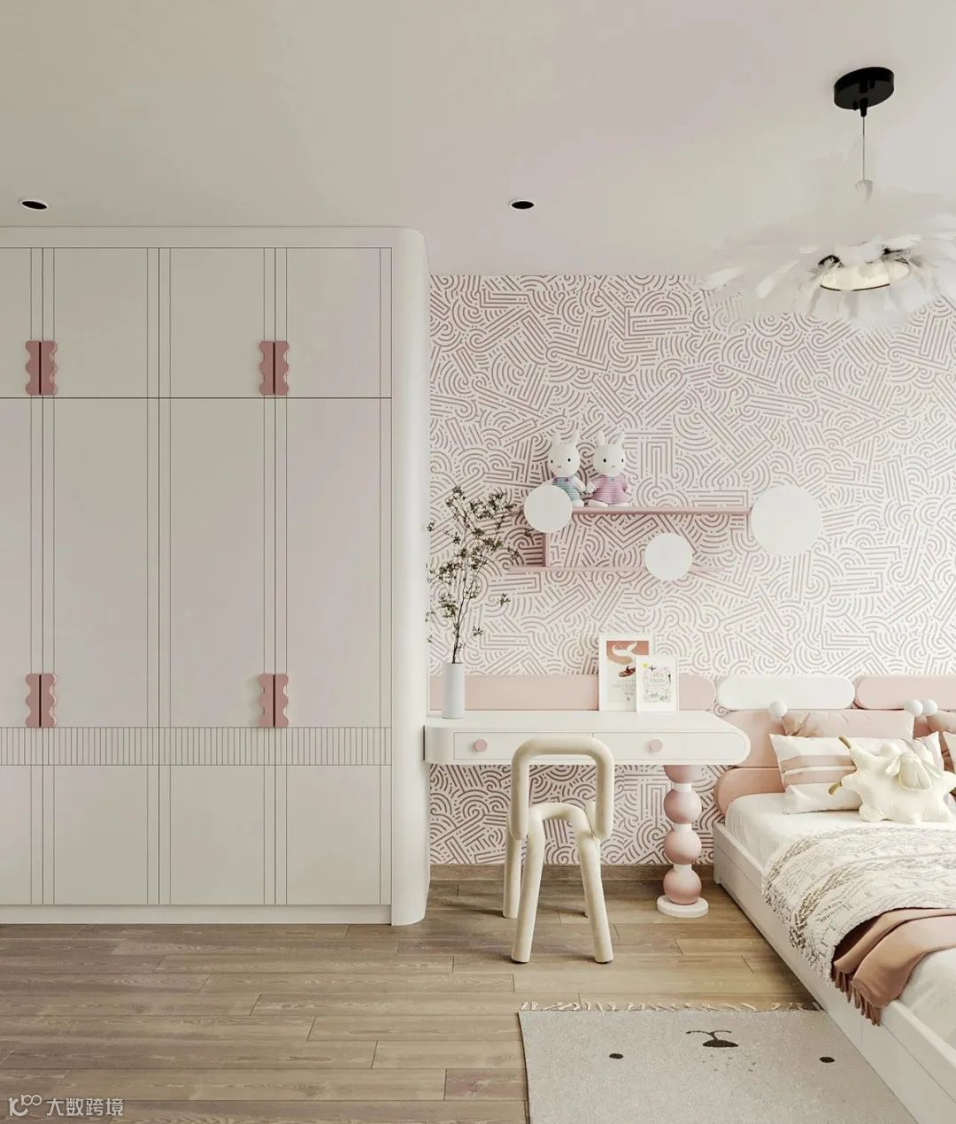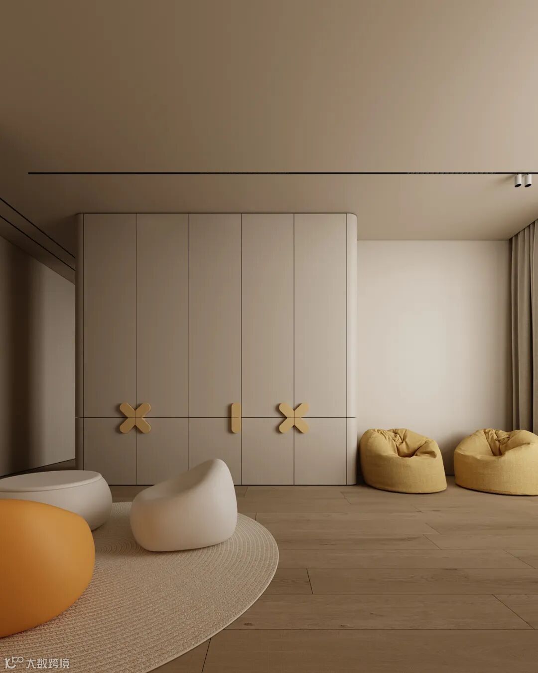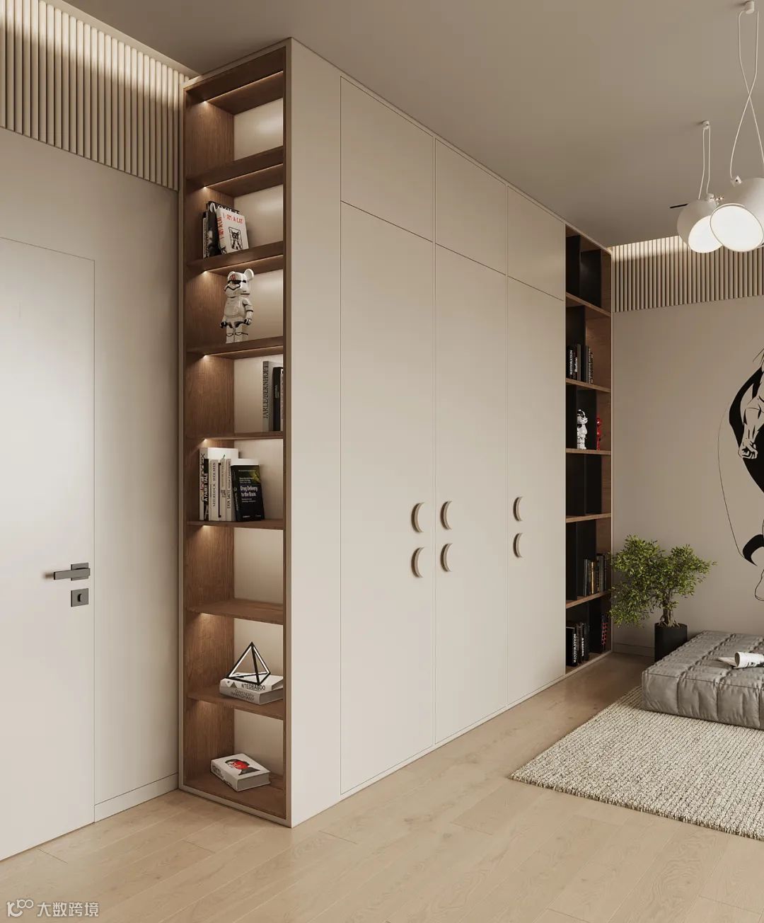 定制衣柜设计个弧形转角,颜值更高,不仅能够防止磕碰到,也为空间带来了更多的艺术感,营造出温馨个性的家居氛围。