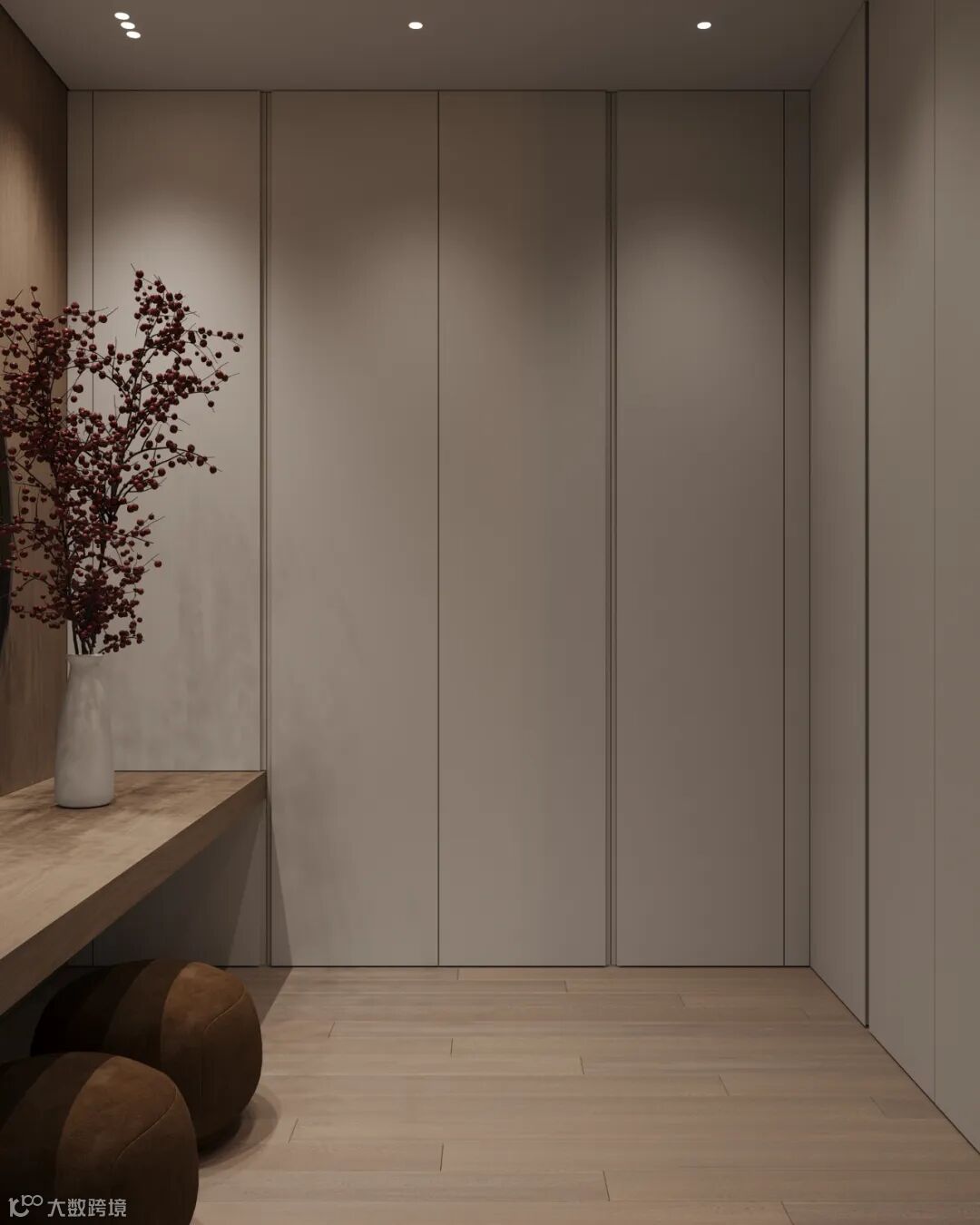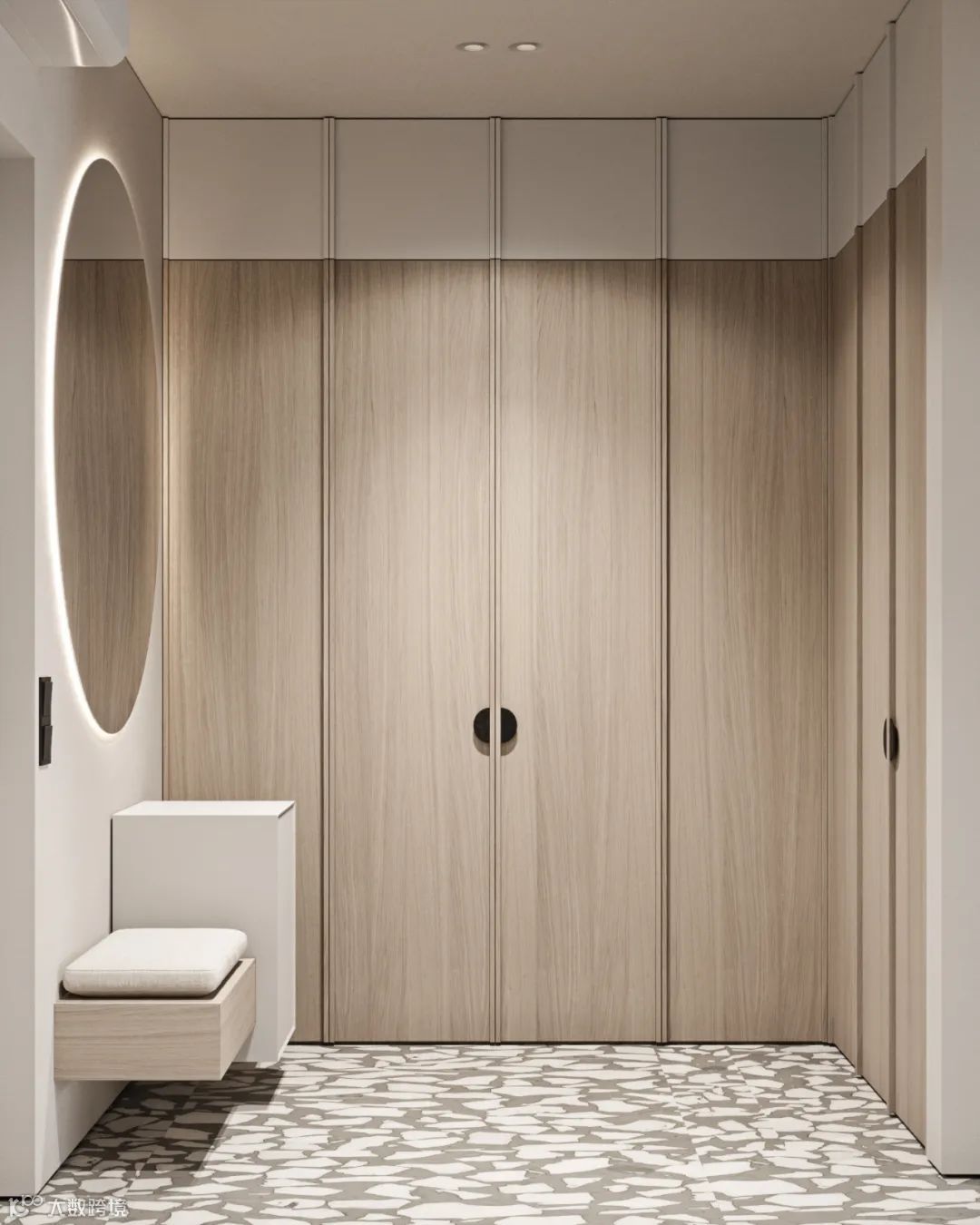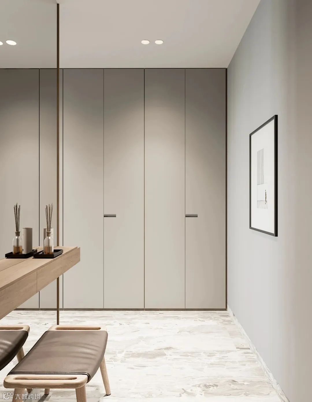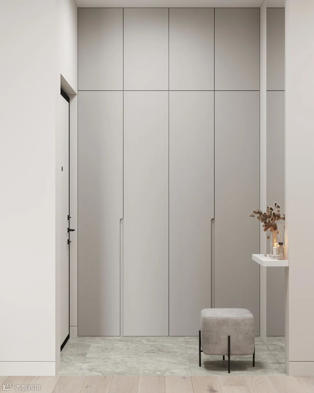 免拉手的衣柜门或暗藏拉手柜门的外观平整,在拥挤的空间下,如狭窄的玄关处,没有凸起的明装拉手,可以减少磕碰的发生。