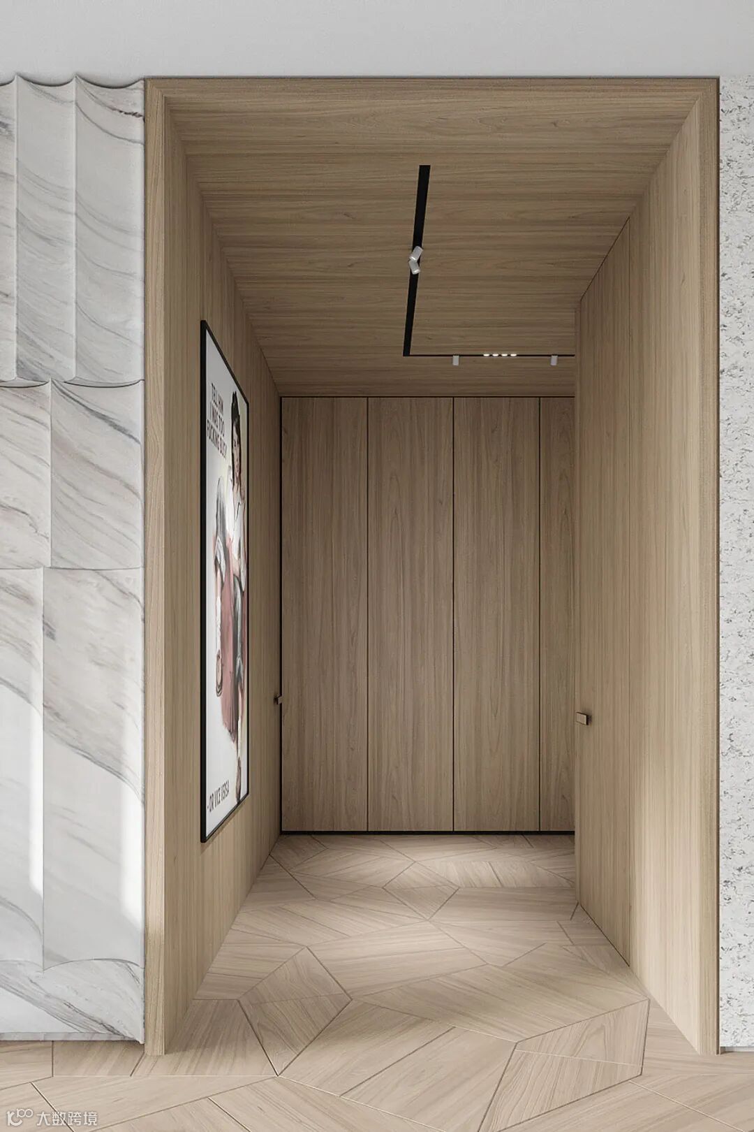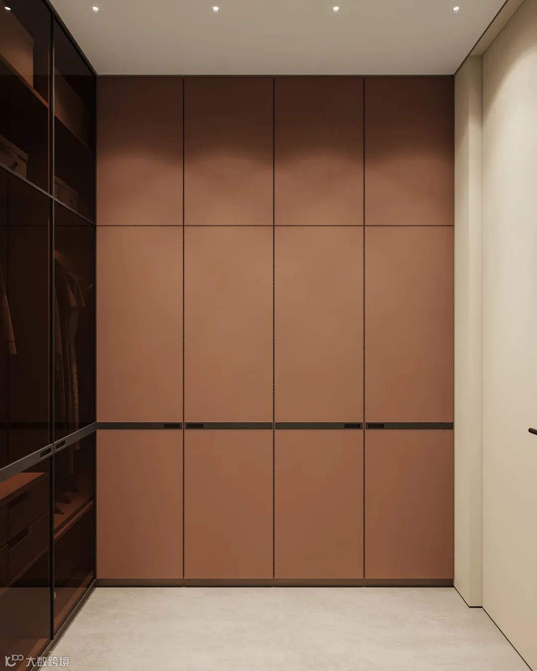 入墙式的衣柜收口设计建议在衣柜两侧加一块小封板,对称的设计会更加美观,做一门到顶的柜子收口板内置会更加高级,外侧板见光的时候,最好做一块与门板同色的见光板,整体会更加美观。