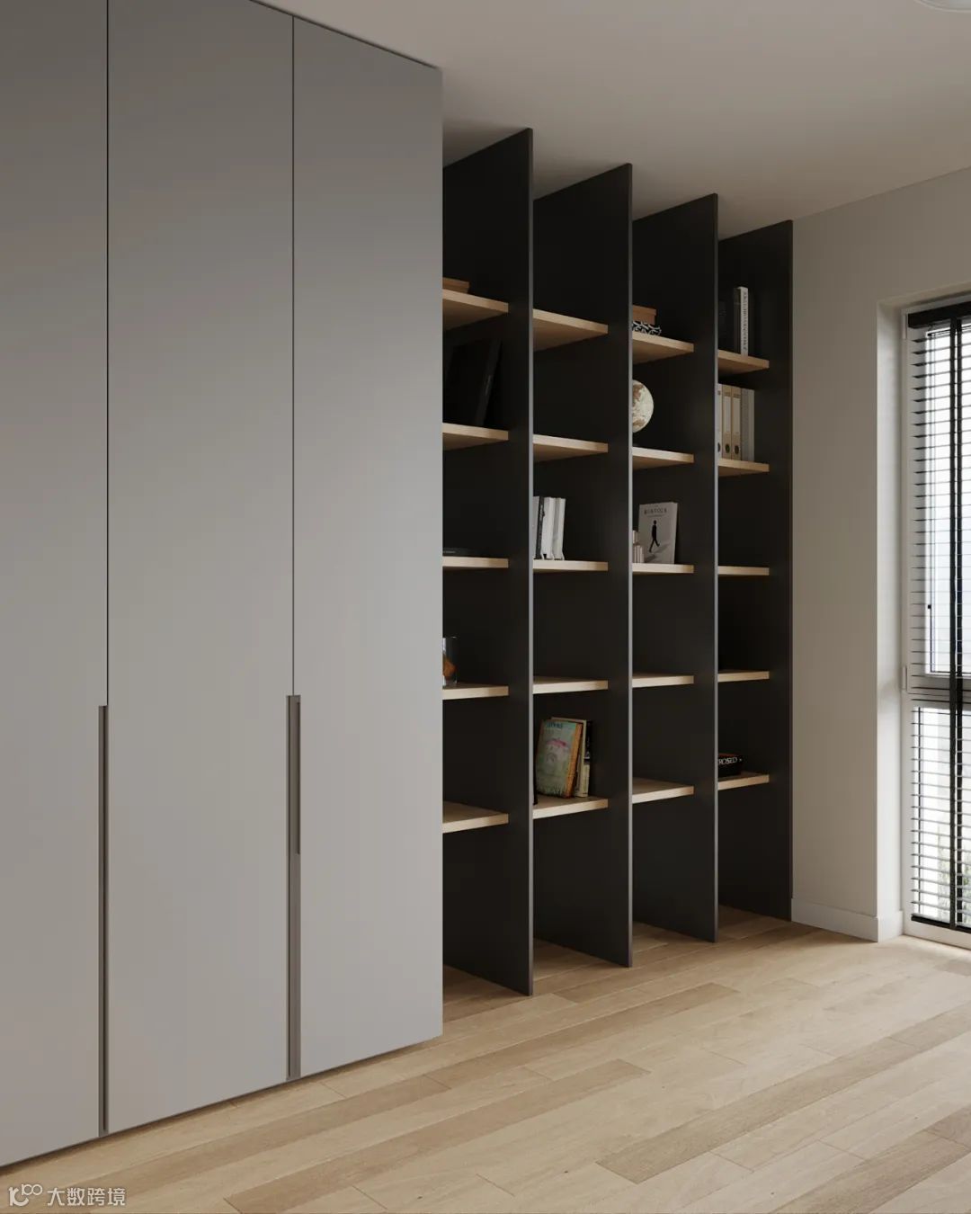 定制柜的设计讲究二八原则,即露二藏八,露百分之二十的物品,藏也就收剩下的百分之八十的物品,能有效平衡展示和隐藏,既要有足够的展示空间,也要有足够的存储空间。