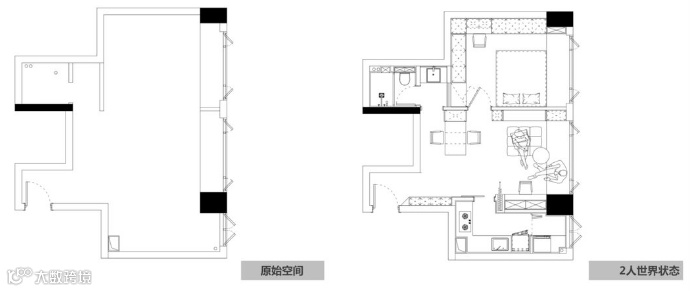 公共空间,同时满足了客厅、餐厅、书房的多重需求,采用定制活动家具来完成空间布局,以适合空间的“小”尺寸需求,打造灵活、轻便、可移动的空间。飘窗设计给予了更时尚的视觉感,而灵动的百叶帘,让空间可吸纳足够的自然光。