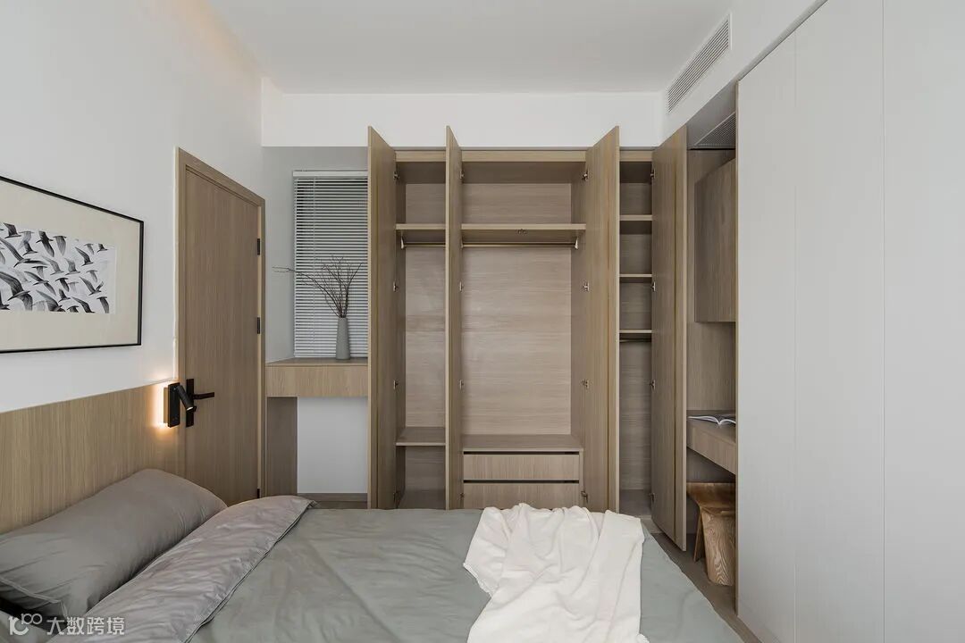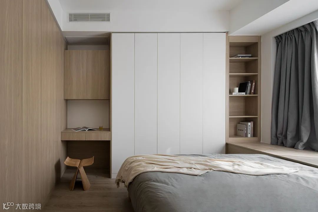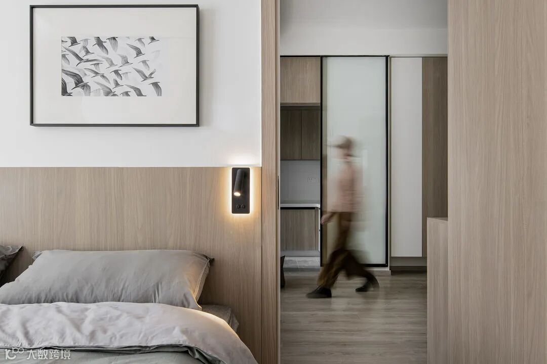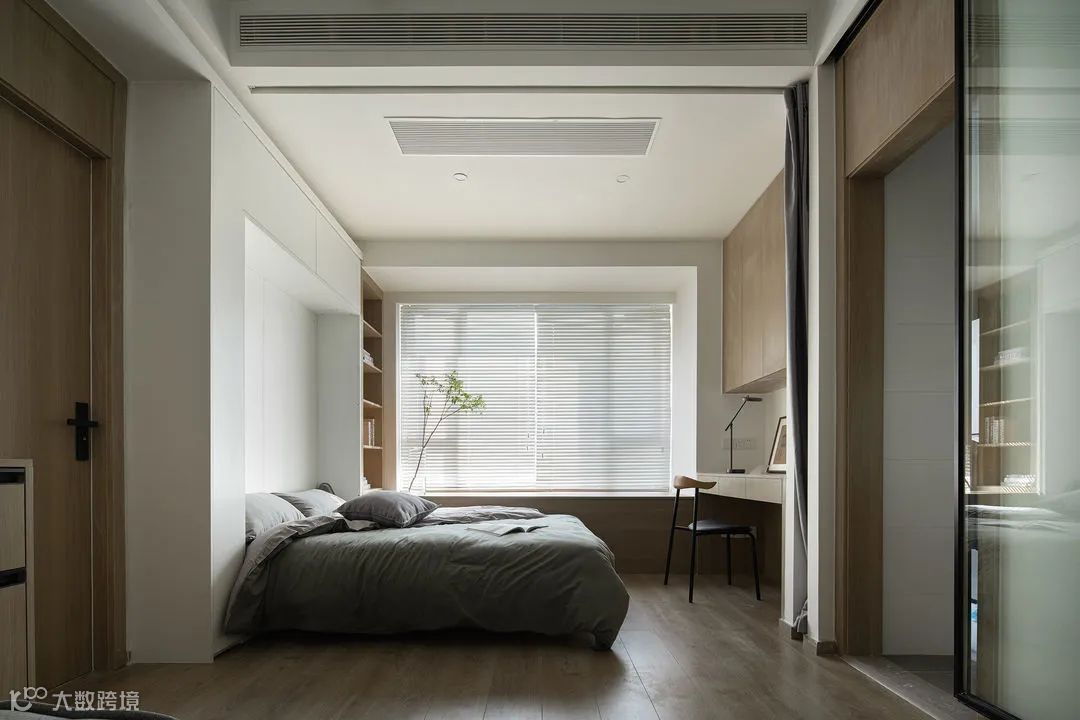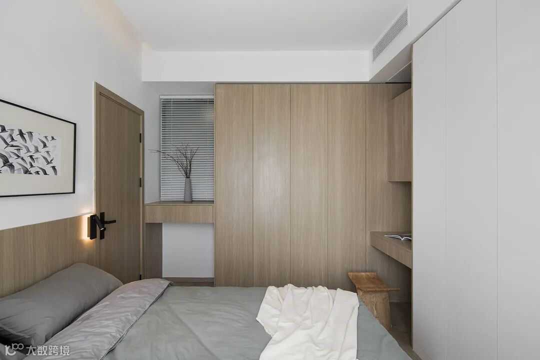 卧室以灰白木色定调,营造自然舒适且静谧的空间氛围。