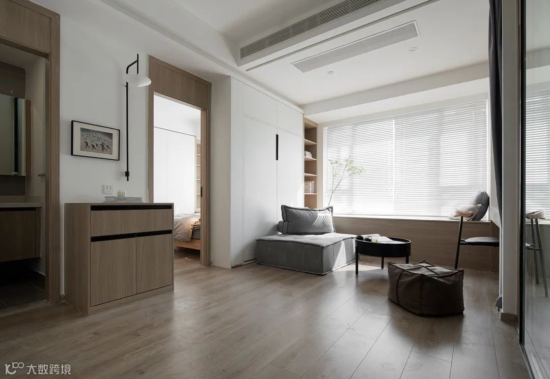 一面纯白柜门,一面纯木色柜门,现代元素与自然元素相结合,让空间更轻松随性。
